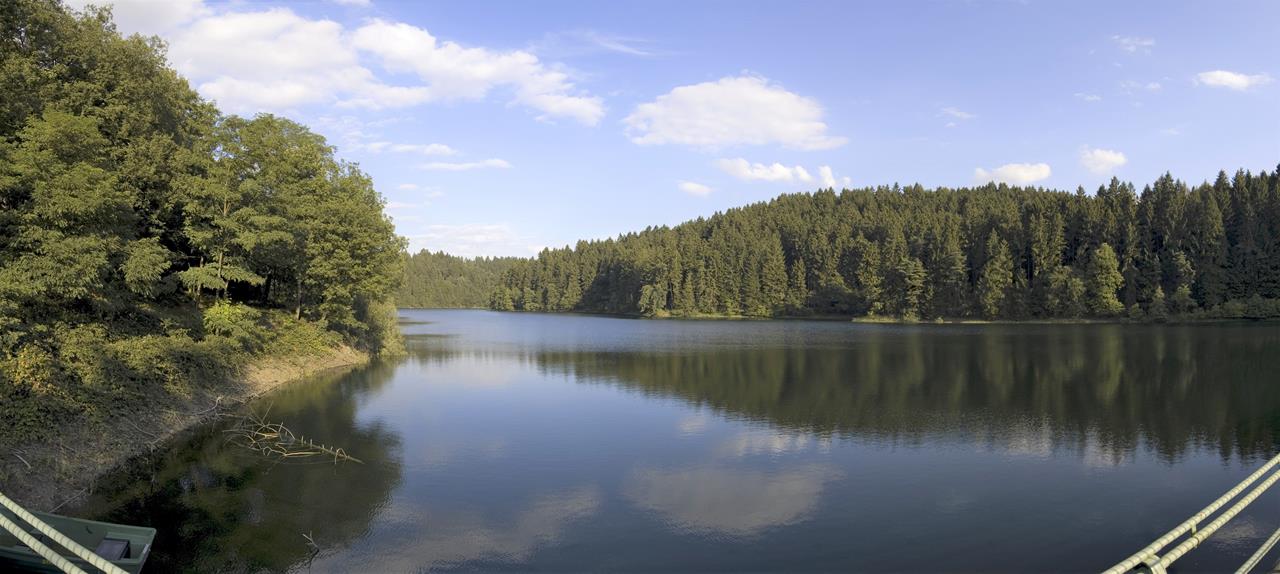 Blick von den Höhen über dem Sengbachtal zur Talsperre