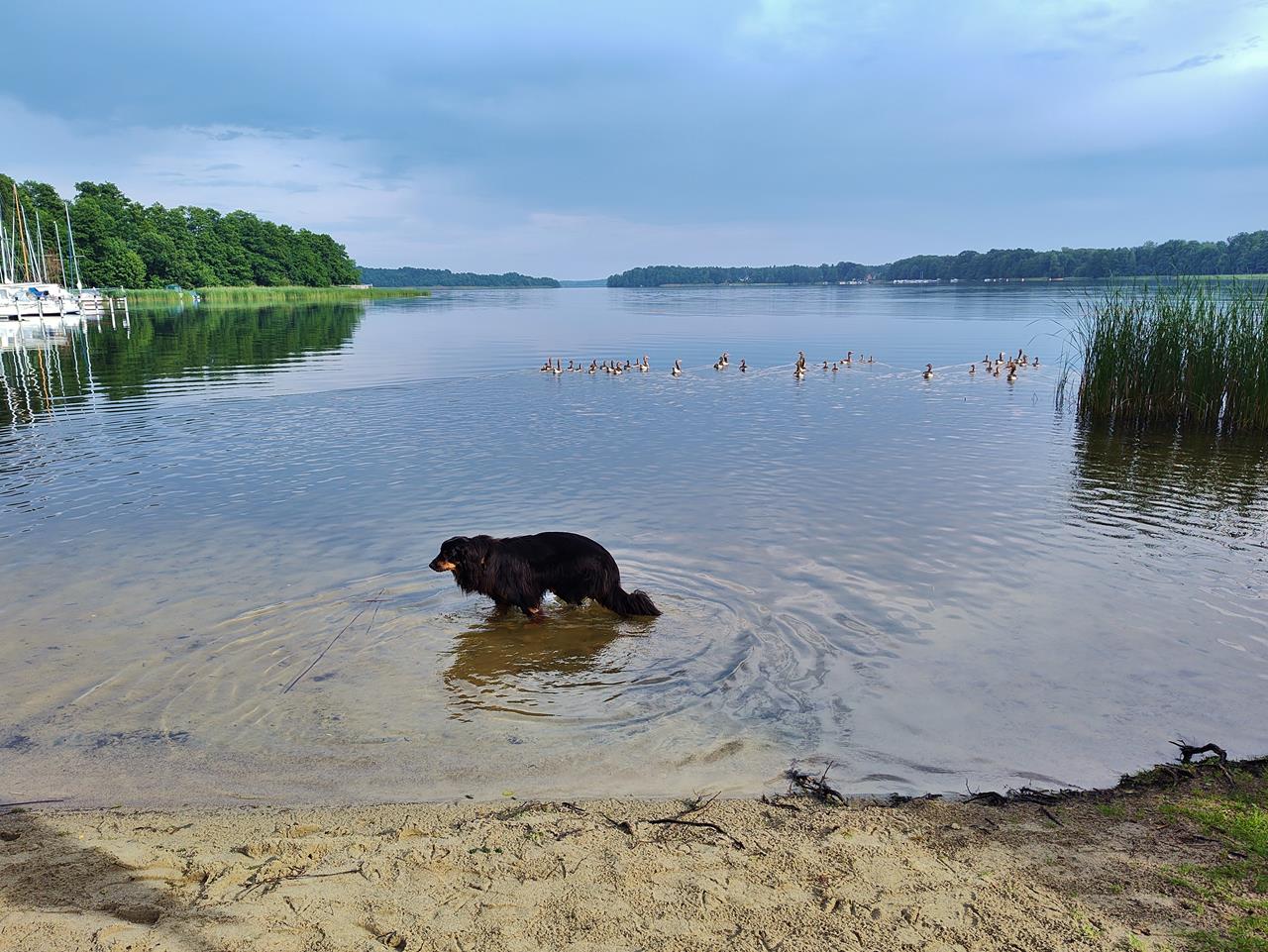 Der See ist über den Storkower Kanal mit weiteren Seen bis nach Berlin verbunden und ein beliebtes Wassersportrevier. Die Wasserqualität ist ausgezeichnet, wie bei nahezu allen Seen in dieser Region.Auf dem See tummeln sich am Abend zahllose Wasservögel. Neben dem öffentlichen Strandbad liegen an Stegen Hausboote und Yachten vor Anker. Doxi lässt es sich natürlich nicht nehmen, ein wenig durch den See zu staksen und sich anschließend ordentlich im Sand abzurollen.