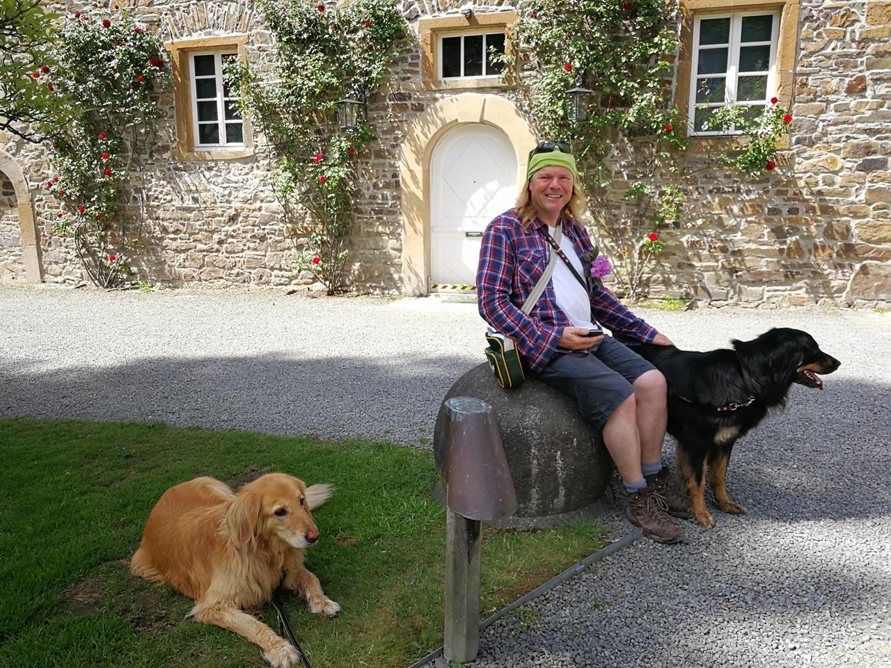 Mai 2017: Endlich ein Moment Schatten! Kurze Pause im Schlosshof mit Bellis und Doxi.