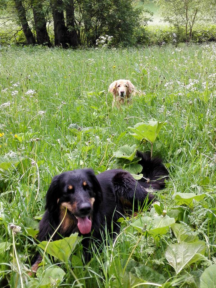 Bellis und Doxi bekommen von alledem nur wenig mit. Sie genießen es, durch den Bach zu stapfen und sich an dessen Wasser zu stärken. Und wir erfreuen uns an der Sonne und der schönen Landschaft an diesem entspannten Samstagvormittag.