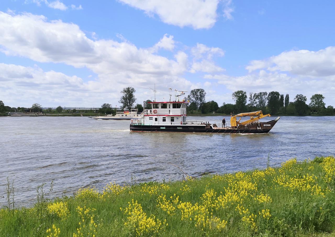 An der Siegmündung begegnen sich die Autofähre Mondorf und ein Wartungsschiff
