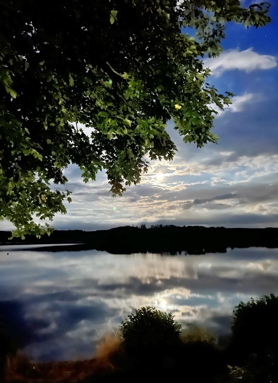 Und schon am nächsten Tag wird das Wetter besser. Am Abend liegt der See ganz ruhig da und wir können aus dem Alkovenbett einen wunderbaren Mondaufgang über dem Wasser beobachten.