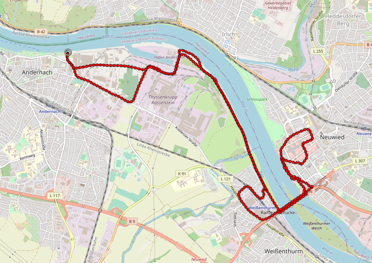 Aber es war eine interessante und abwechslungsreiche Tour. Vom Womo-Stellplatz am Rhein in Andernach ging es zunächst durch den Hafen von Andernach mit seinen Verladeanlagen, Container-Terminals und dem großen Stahlwerk Thyssenkrupp Rasselstein.