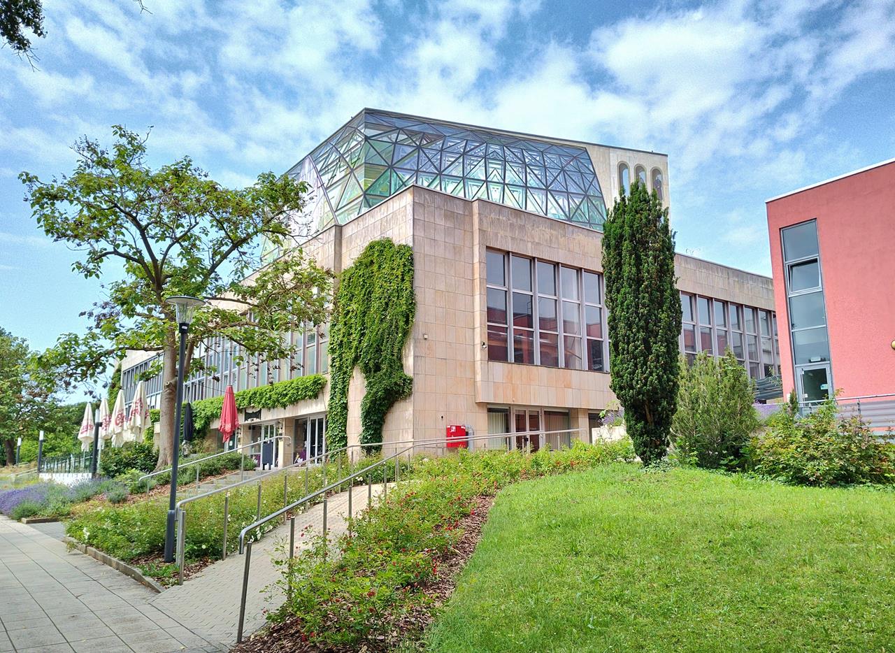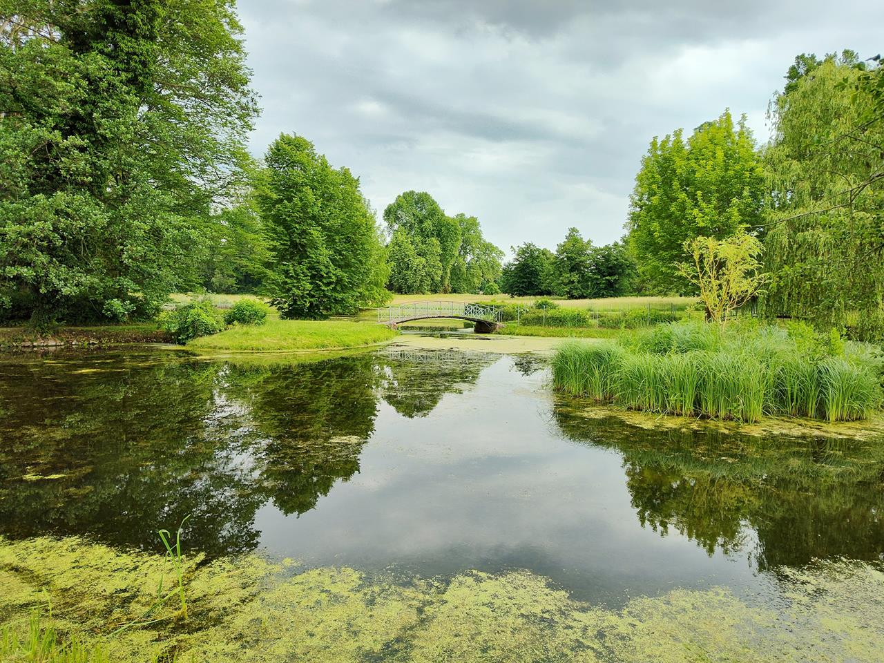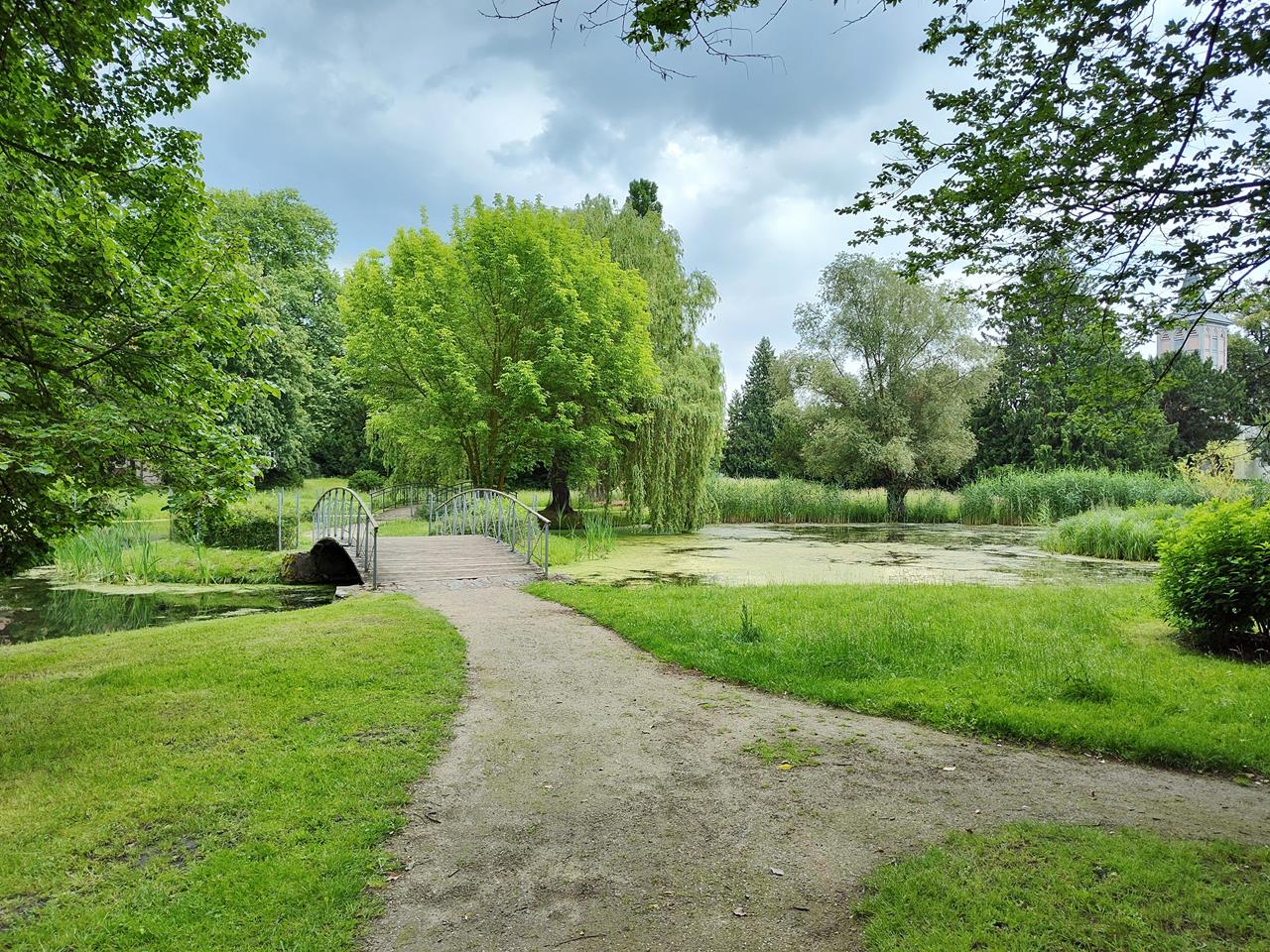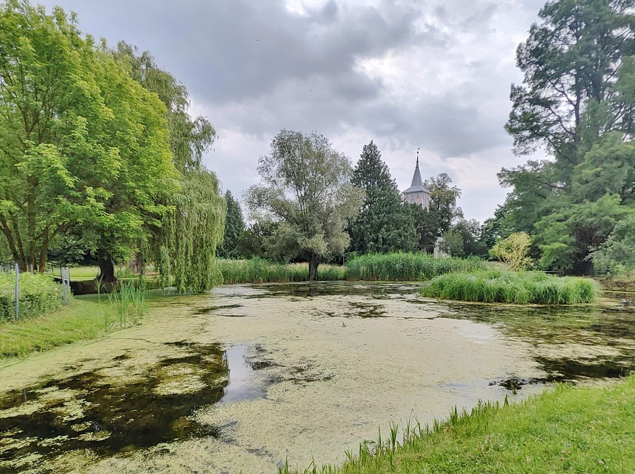 Die Anlage ist eingebettet in den schönen Lenné-Park mit einem wertvollen Baumbestand und idyllischen Teichen, aus denen uns ein wahres Froschkonzert empfängt. Im Park befindet sich auch die kleine Dorfkirche.