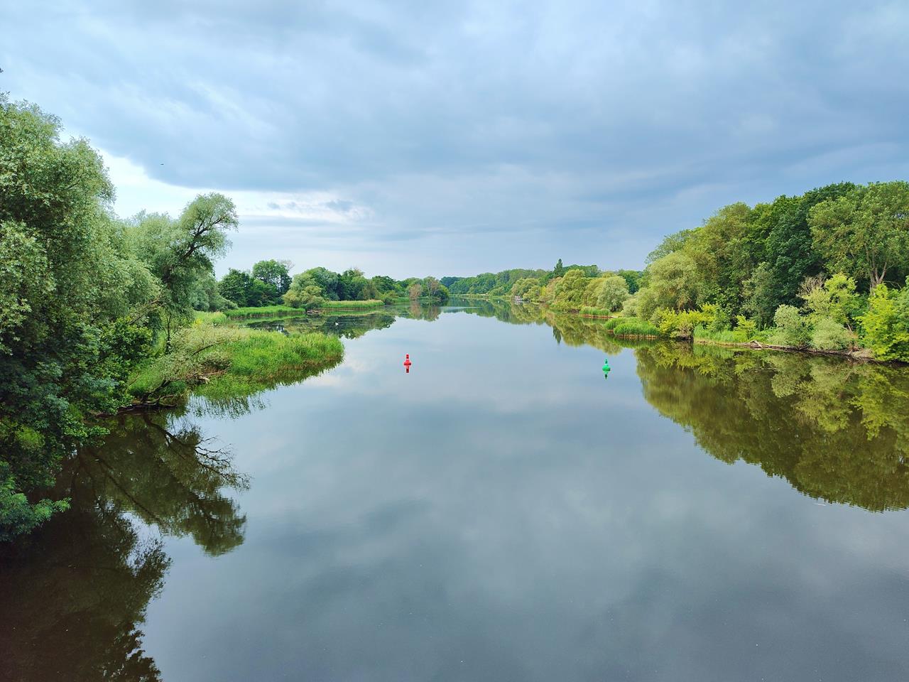Wo die Grenze den Fluss verlässt, befinden sich die Köstiner Wiesen. Dort kann man auf einem Aussichtsturm in die Auenlandschaft, auf den Fluss und hinüber nach Polen blicken. Auch wir verlassen hier die Oder und wenden uns in Richtung des Stettiner Haffs.