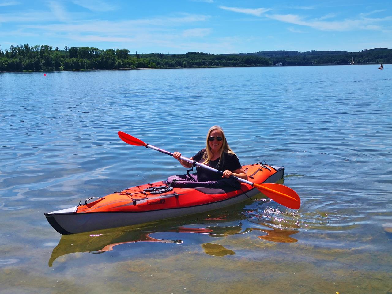 Obwohl es grau ist und zeitweise regnet, gehen wir trotzdem gleich schwimmen und paddeln. Auf dem See ist wegen des Wetters gar nichts los und alles ganz ruhig. Herrlich ist das.