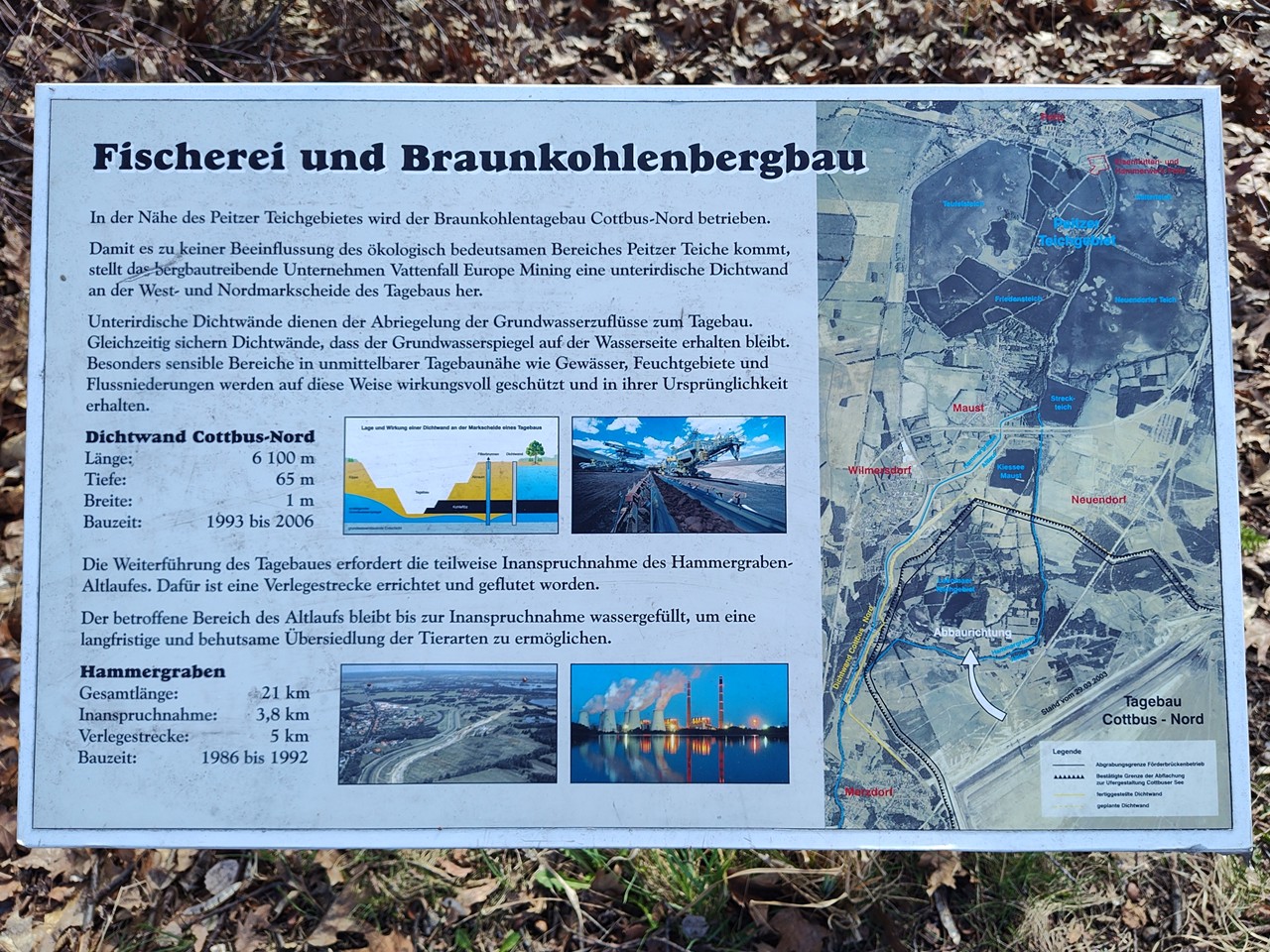 Zwischen den Teichen existieren Wirtschaftswege, über die man das Gebiet wunderbar erwandern kann. Fast immer im Hintergrund sichtbar: Die mächtigen Schlote des Kraftwerks Jänschwalde mit seinen sechs 500 MW-Blöcken, ursprünglich aus sowjetischer Produktion.