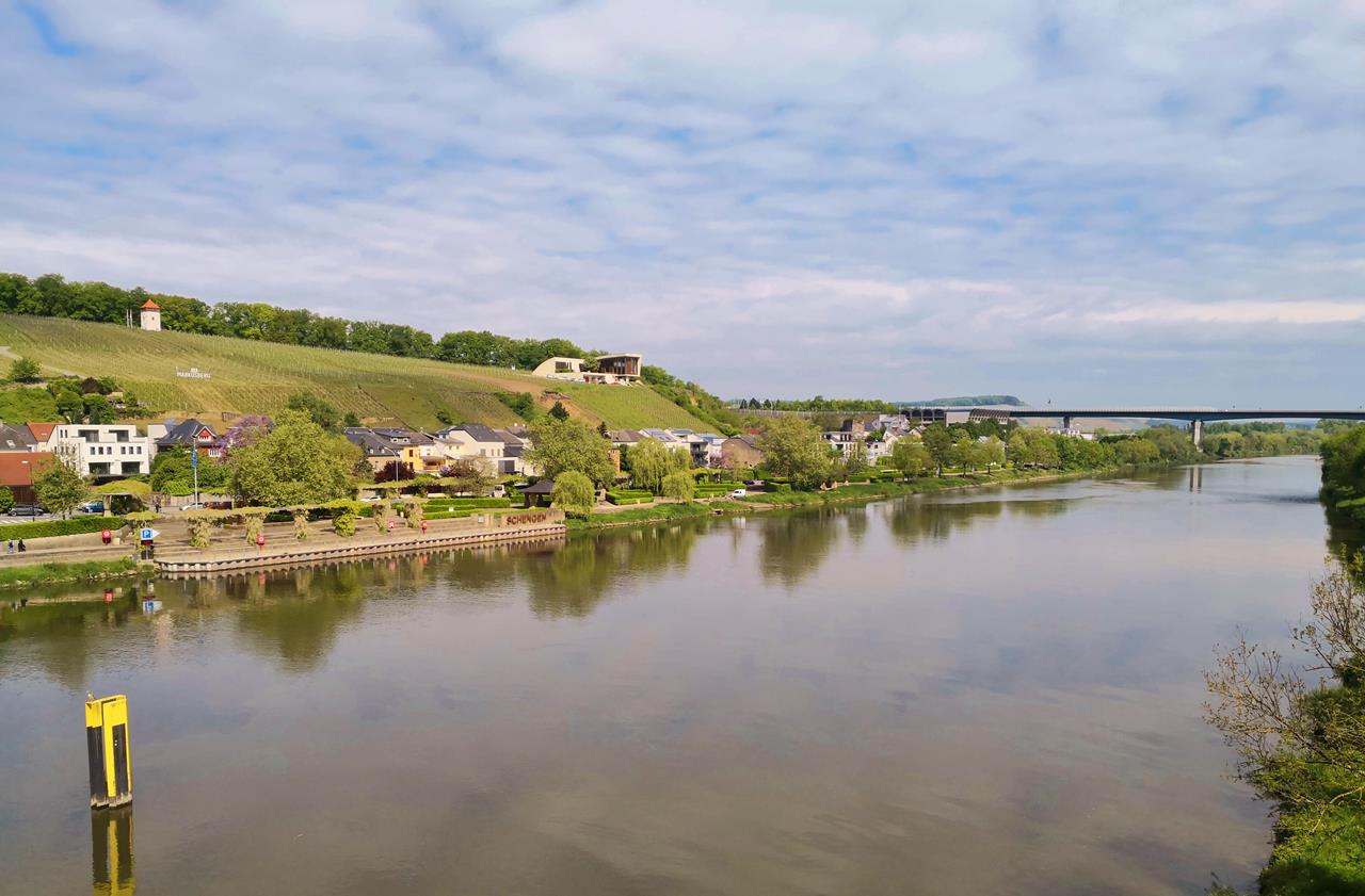 Blick von der Moselbrücke hinüber nach Schengen und zum Europa-Museum am Ufer.