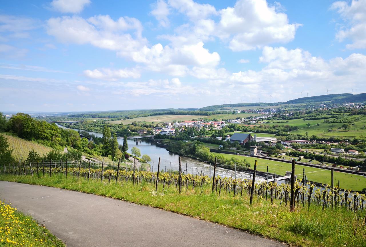 Blick von den Moselhängen oberhalb von Schengen hinunter nach Perl und zur Moselschleuse