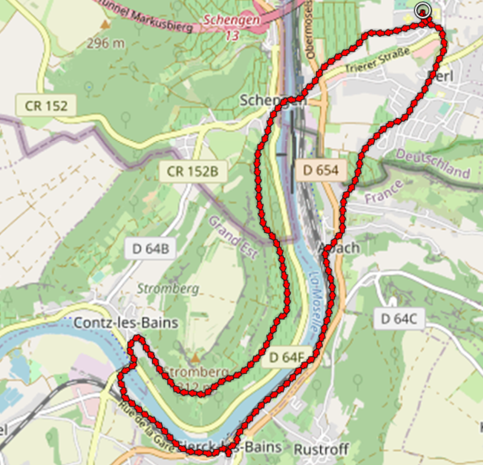 Wir wandern durch den Ort und steigen in die Weinberge auf. Nach einer Weile passieren wir die Grenze zu Frankreich. Aber würde mein Handy jetzt nicht eine Willkommen-SMS des Netzbetreibers empfangen – ich würde es gar nicht bemerken. Erst im nächsten Dorf an der Mosel fallen dann die Unterschiede auf: eine leicht andere Architektur und Wohlstandsniveau, veränderte Strommasten und Straßenlaternen und natürlich die französischen Kfz-Kennzeichen.