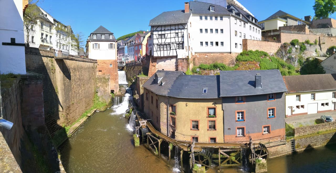 Blick vom Saarufer auf die historische Altstadt von Saarburg