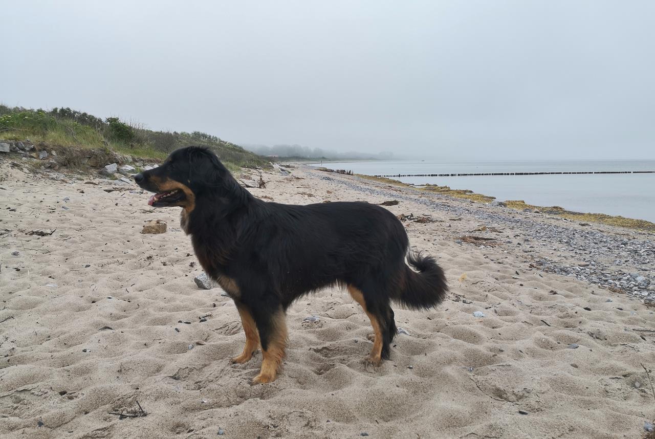 Das Thermometer heute steht auf „Badesaison“. Am kilometerlangen Sandstrand vor den Prora-Blöcken ist bereits einiges los. Heike nutzt die Gelegenheit, um mit Doxi am Hundestrand ein wenig durchs Wasser zu waten. Man kann sich vorstellen, was hier ein Trubel herrschen mag, wenn in wenigen Wochen die Schulferien in Deutschland beginnen – vor allem jetzt, in Corona-Zeiten.