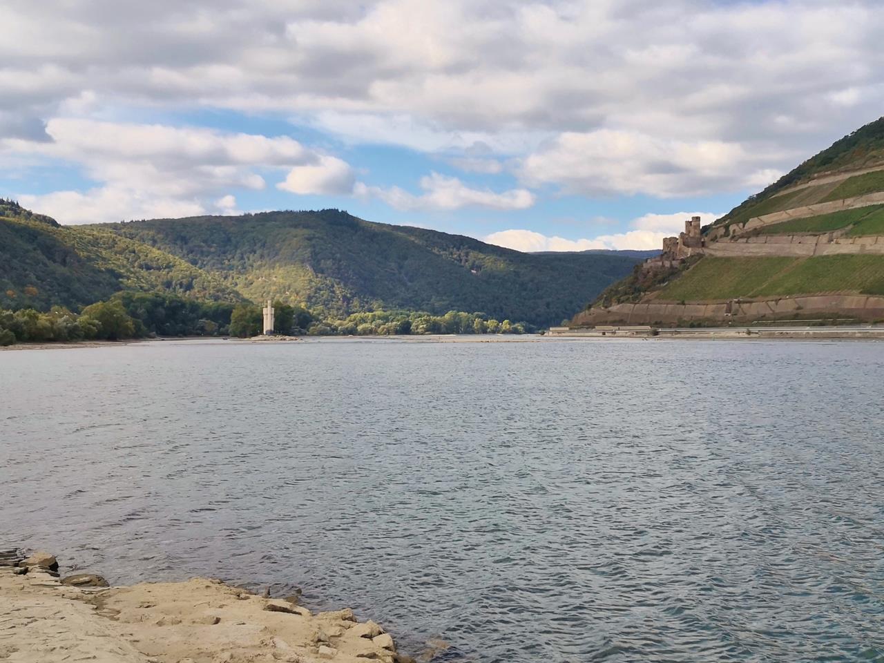 Das Panorama an der Nahe-Mündung ist imposant. Links auf einer kleinen Rheininsel der Binger Mäuseturm, dahinter am gegenüber liegenden Ufer die Ruine der Burg Ehrenfels. Der Rhein bildet hier die Grenze zwischen Rheinland-Pfalz und Hessen.