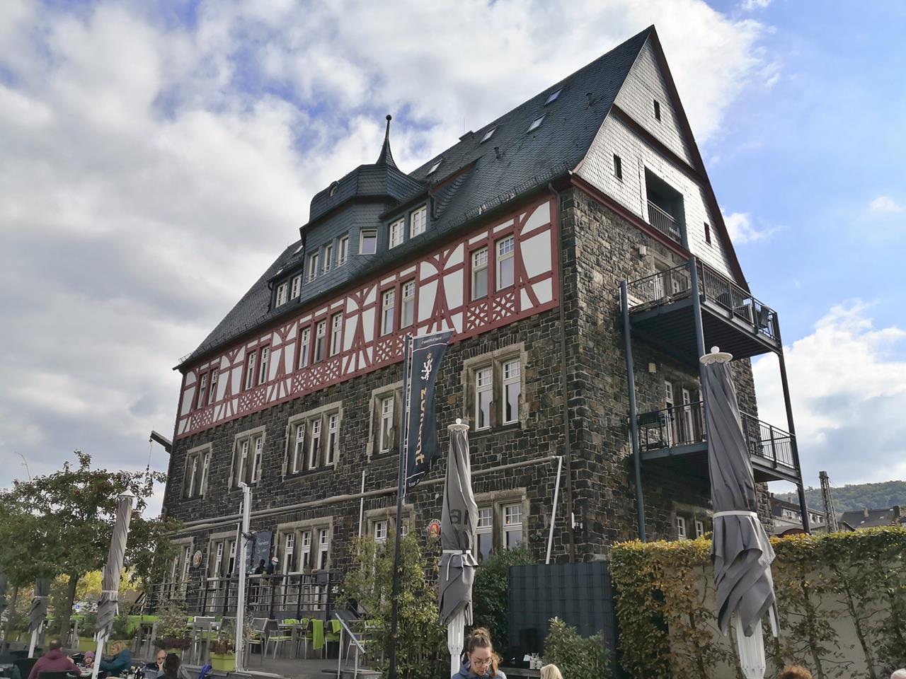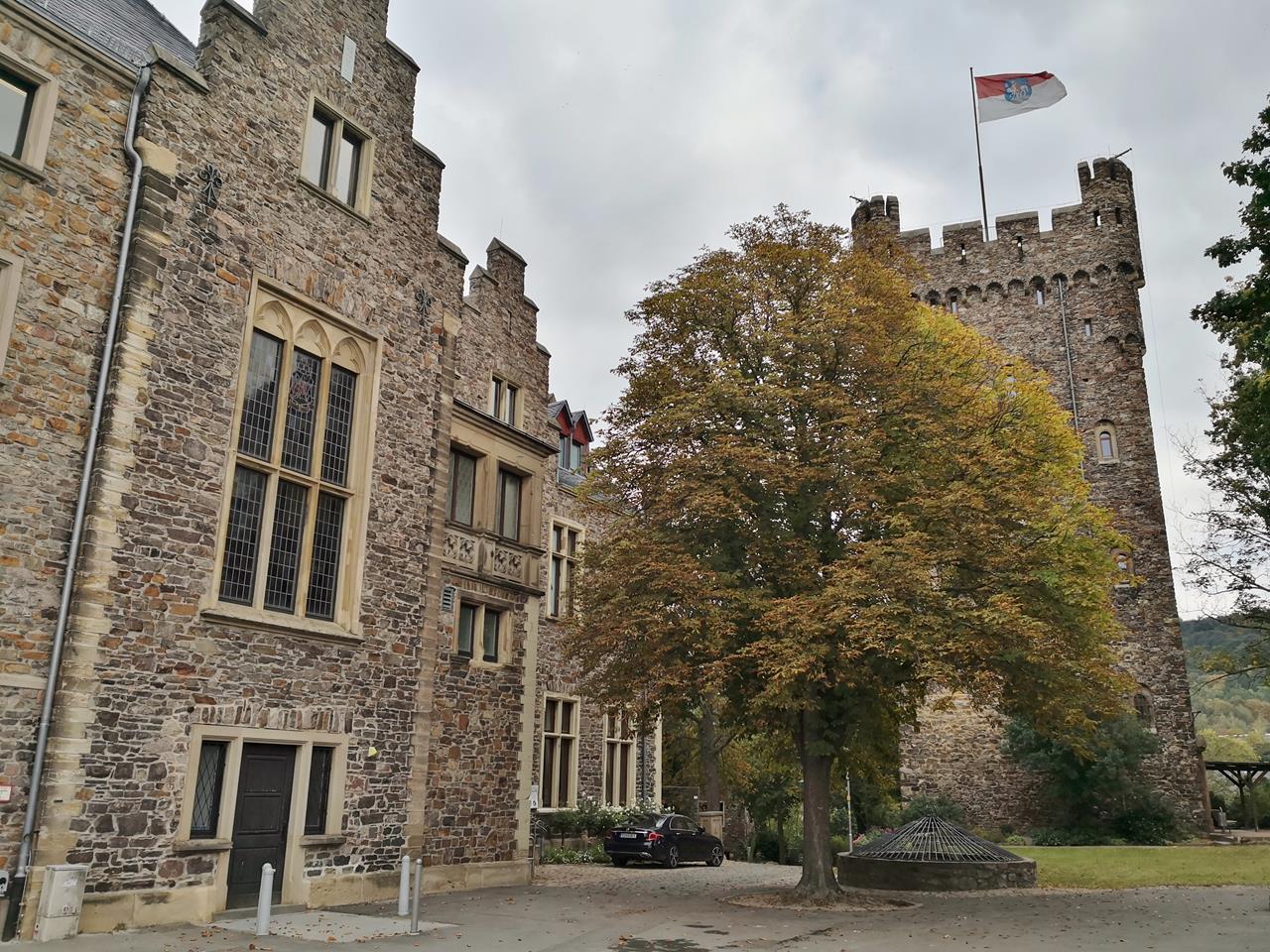 Mit Doxi laufe ich ein Stück an der Rheinpromenade stromaufwärts. Anschließend steigen wir durch das Ortszentrum von Bingen zur Burg Klopp auf, in der heute die Stadtverwaltung residiert. Von dort haben wir noch einmal einen herrlichen Panoramablick auf die Nahemündung und den Rhein.