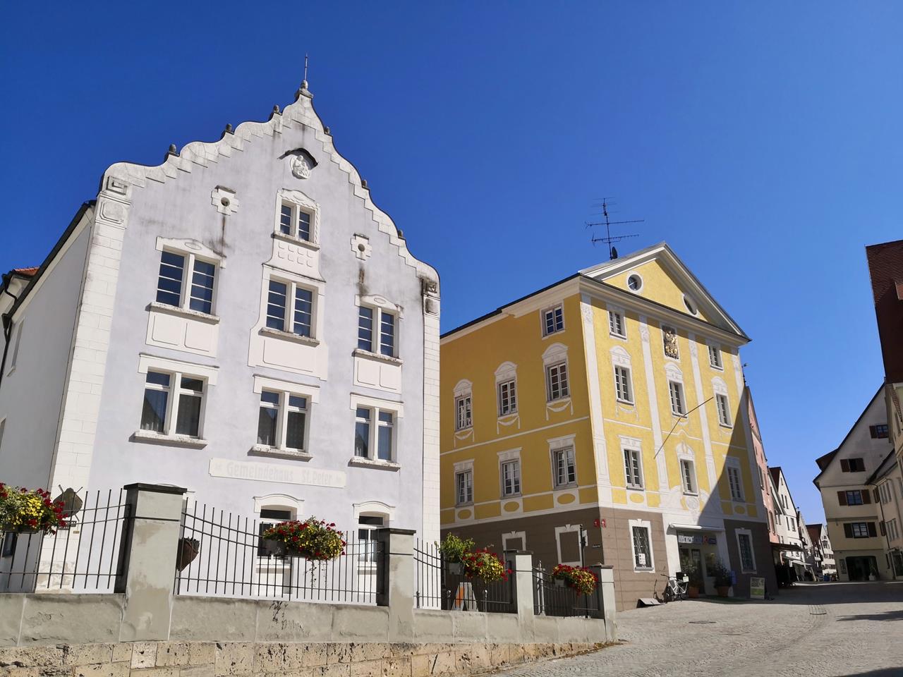 Am Mittag begebe ich mich mit Doxi auf eine interessante Wanderung, die den Titel „Moor, Wald und Felder bei Bad Waldsee“ trägt. Zunächst geht es von der Therme hinunter in den Ort und durch die historische Altstadt, vorbei an den zwei weithin sichtbaren Türmen der Stiftskirche St. Peter, die bewusst versetzt zueinander stehen.
