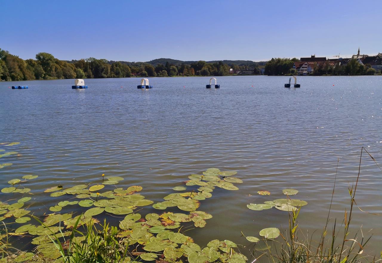 Mitten im Ort gleich neben der Altstadt liegt ein großer Natursee, der u. a. für das Freibad der Stadt genutzt wird. Wir stehen mit dem Wohnmobil auf dem großen Stellplatz an der beliebten Therme Bad Waldsee.