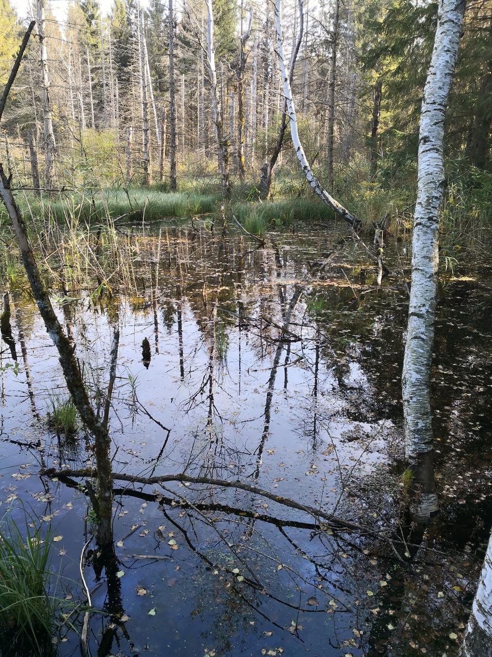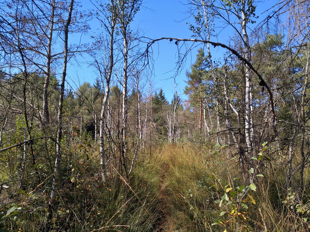 Wir laufen in nordwestlicher Richtung aus dem Ort hinaus. Hinter dem Ortsteil Steinach erstrecken sich zwei ausgedehnte, zum Teil stark mit Wald bewachsene Moor- und Auwaldregionen. Überall im Wald begegnen uns moorig dunkle Wasserflächen mit einer entsprechenden Vegetation, und Doxi lässt sich die schwarze Brühe schmecken 😉