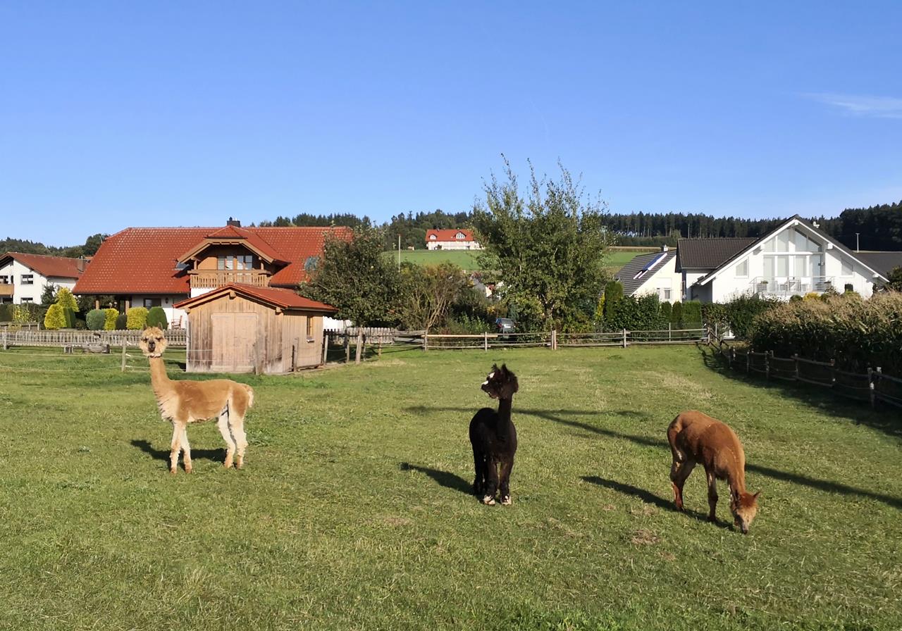 Keine zwei Kilometer weiter haben wir beim Abstieg nach Kaufbeuren eine weitere tierische Begegnung. Wir passieren eine Kuhweide. Ein Schild weist darauf hin, dass Rindviecher auf der Wiese präsent sind, und sie kommen auch gleich angerannt: Sechs Jungkühe, die ganz neugierig auf uns sind.