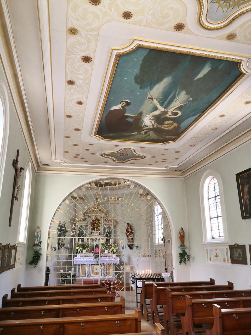 Durch dichten Wald laufen wir zurück in Richtung Haidgau. Mitten im Wald stoßen wir auf die Sebastianskapelle, einem bedeutenden Wallfahrtsort der Region. Die schmucke Kapelle ist nicht verschlossen, und so kann ich einen Blick in das Innere werfen.
