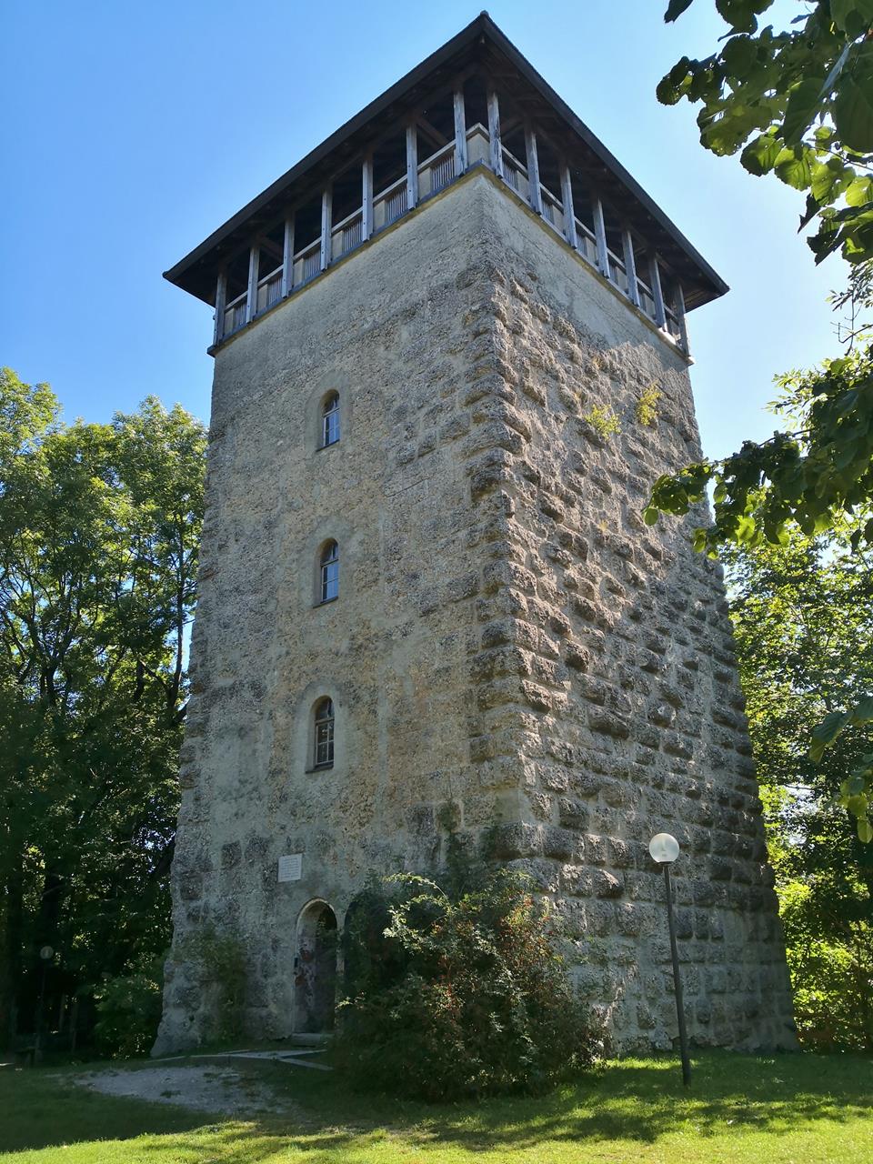Ich leine Doxi unten im Schatten des Turmes an und mache mich an den Aufstieg. Von der Spitze des Bergfrieds hat man einen wunderbaren Fernblick auf das Ammergebirge und das Karwendelgebirge.