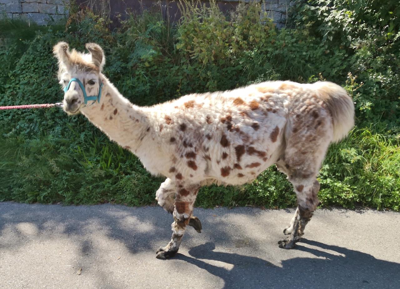 Als ich wieder herab steige und aus dem Turm heraus trete, traue ich meinen Augen nicht: Doxi ist umringt von einer Gruppe Lamas mit ihren Führern. Ich zähle 15 Tiere – jedes in einer anderen Farbe und Zeichnung. Einige sind offensichtlich sehr an Doxi interessiert und nähern sich ihr vorsichtig Schritt für Schritt, aber Doxi bleibt ganz entspannt.