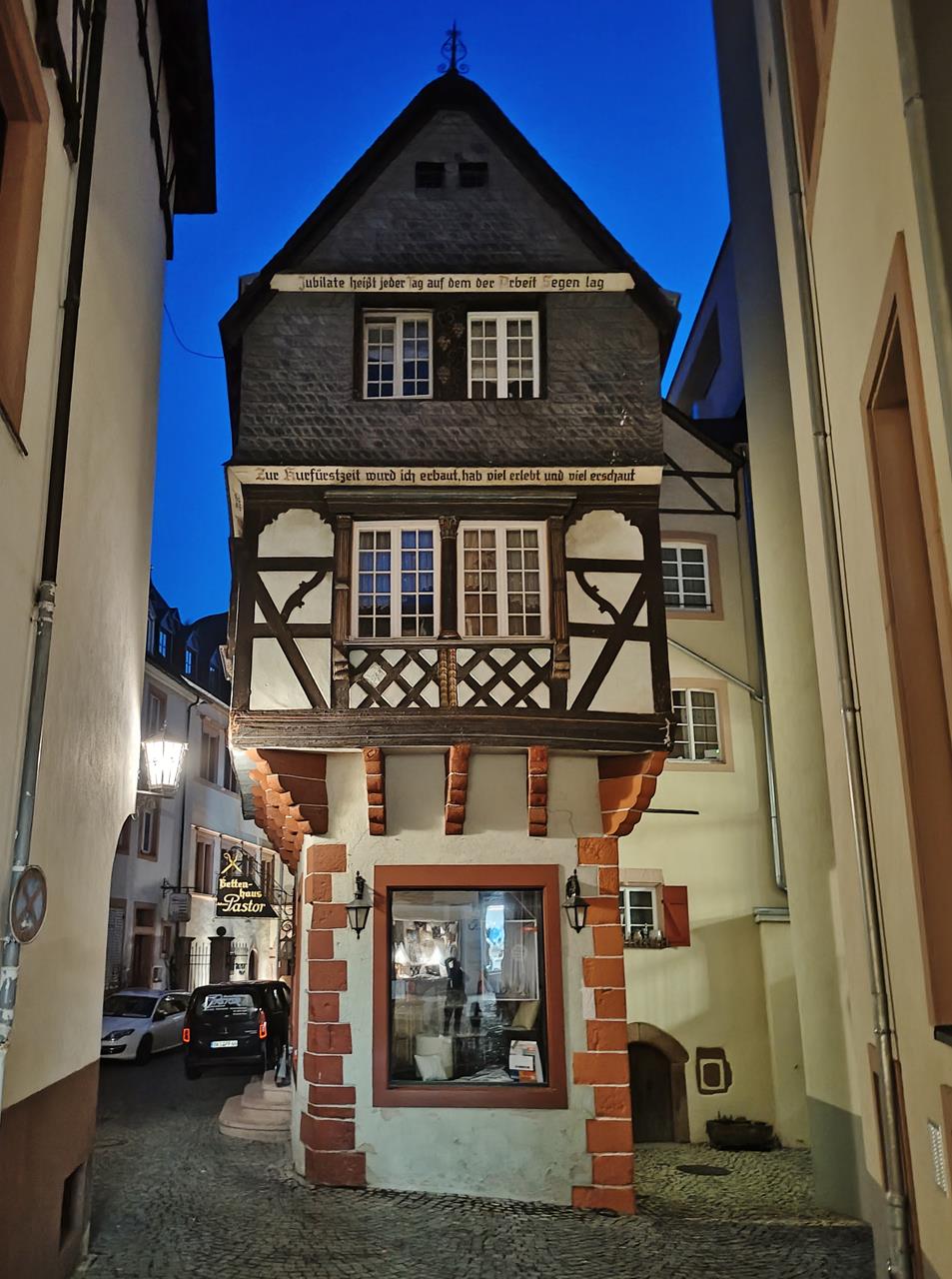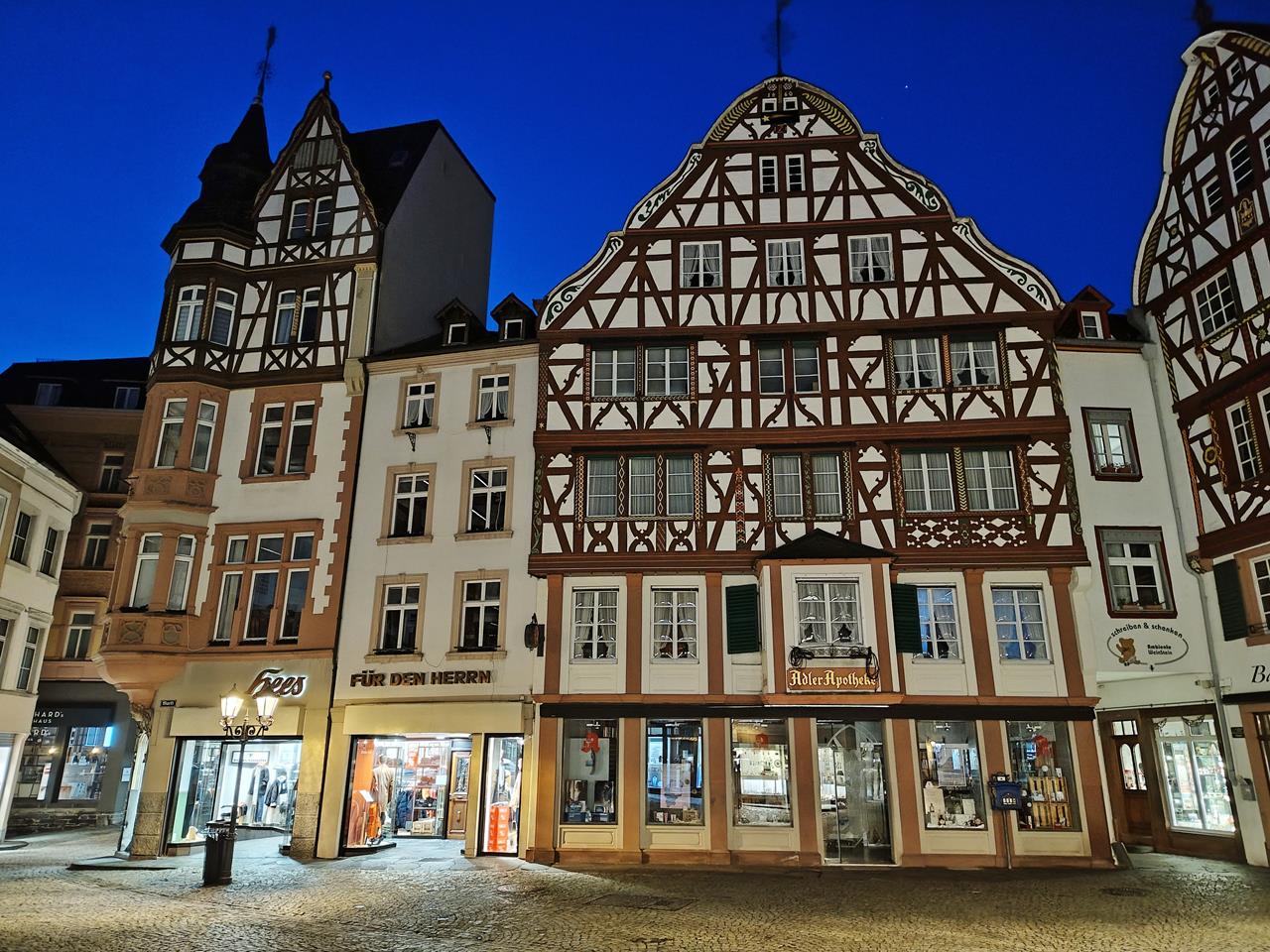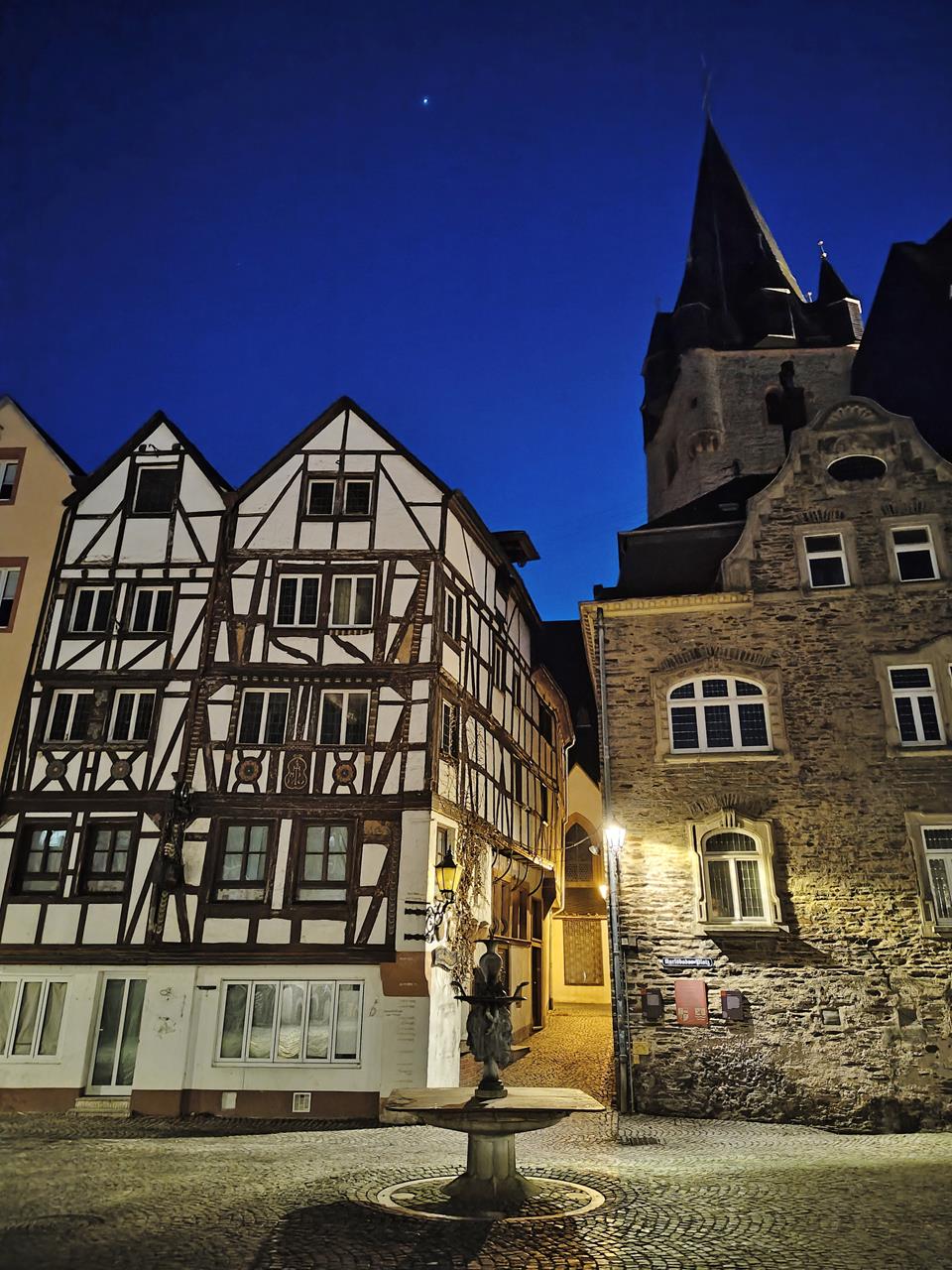Am frühen Abend wandere ich in der aufziehenden Dunkelkeit von meinem Stellplatz auf dem Kuser-Plateau hinunter zur Mosel nach Bernkastel-Kues. Ich möchte einen kleinen Nachtspaziergang durch die Altstadt unternehmen.