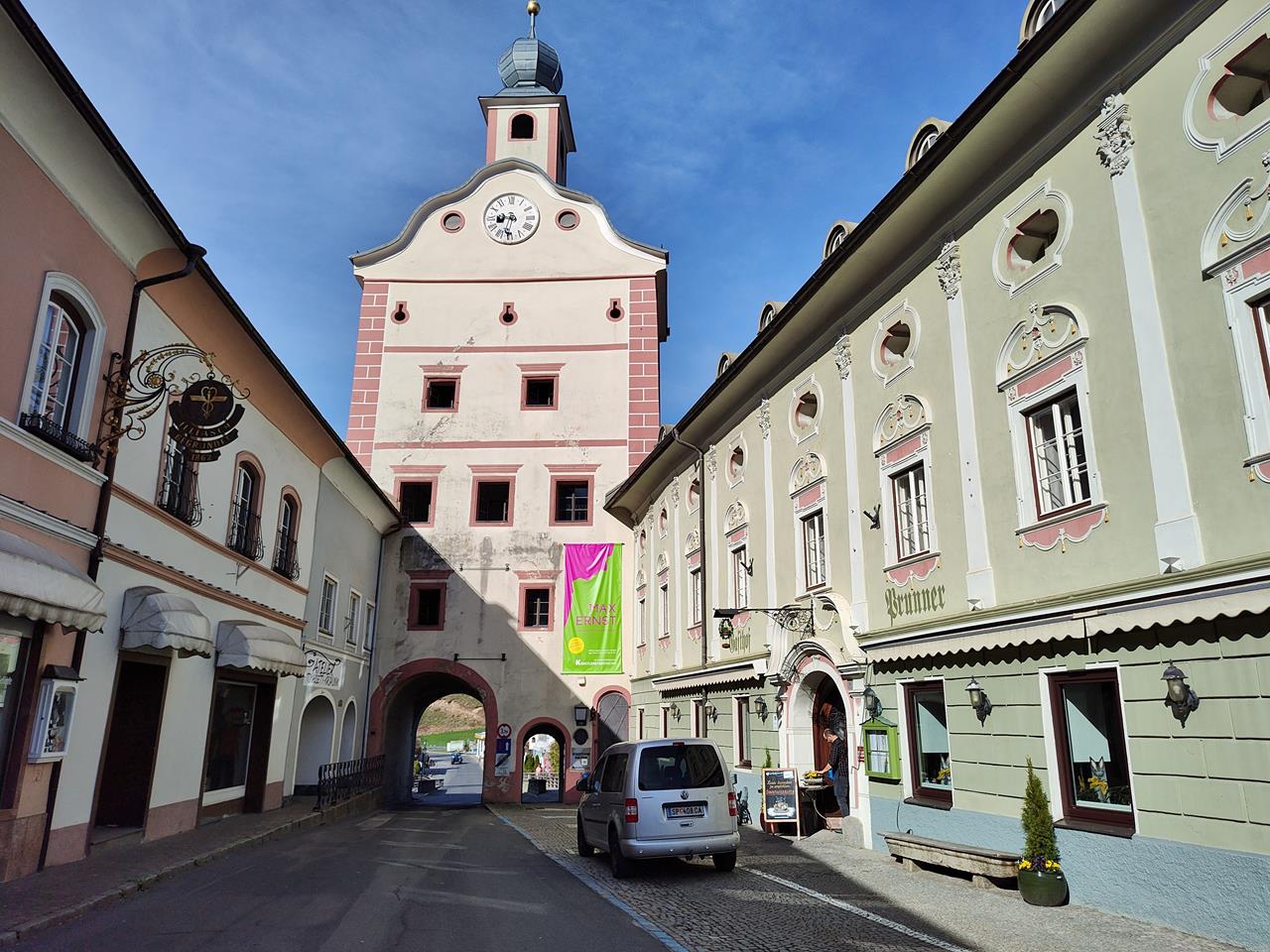 Viele Menschen sind am frühen Nachmittag bei herrlichem Sonnenschein und 25 Grad rund um den Stadtplatz unterwegs. Man sitzt im Café oder gönnt sich ein Eis. Frühsommer im April, das gab es auch schon lange nicht mehr.