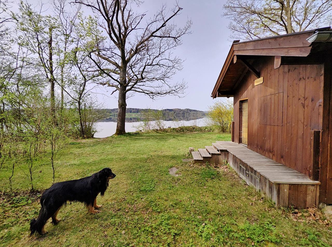 Das Wasser im See ist ganz klar, und Doxi lässt es sich nehmen, die Wasserqualität des Sees zu testen. Am gegenüberliegenden Ufer gibt es einige Badestellen und Campingplätze, doch auf dieser Seite wirkt alles sehr naturbelassen. Ein Schild weist darauf hin, dass hier u.a. Kreuzottern leben. Da wollen wir natürlich nicht stören.