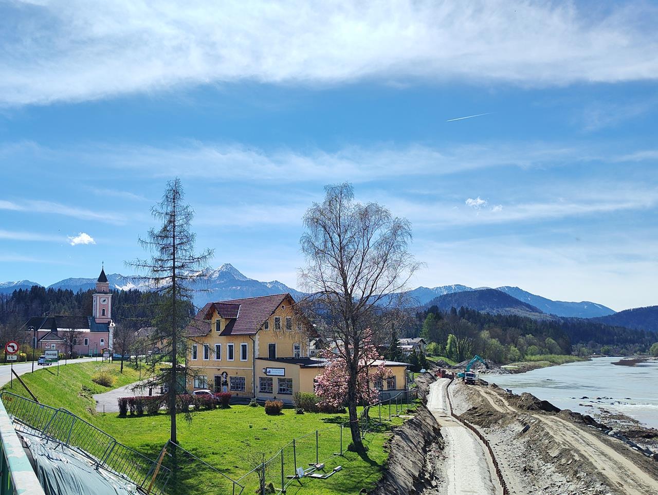Beim Ort Rosegg überquere ich zunächst die Drau, um mich dann Richtung Egg am Faaker See zu halten. Das Dorf liegt etwas oberhalb und bietet an einigen Stellen einen tollen Blick auf den See und weiter zu den dahinter liegenden Karawanken.