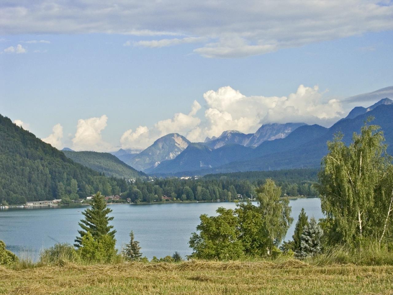 Blick aus Faake hinunter zum See. Im Hintergrund: der Mittagskogel in den Karawanken.