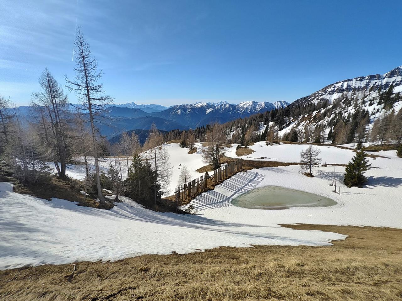 Auf dieser Höhe liegt teilweise noch ordentlich Schnee. Je tiefer man kommt, desto größer werden zwar die schneefreien Flächen, doch die vorgesehene Wanderung mit Doxi rund um den Goldeck musste ich auf halber Strecke abbrechen, weil wir teilweise oberschenkeltief im Schnee eingesunken sind.