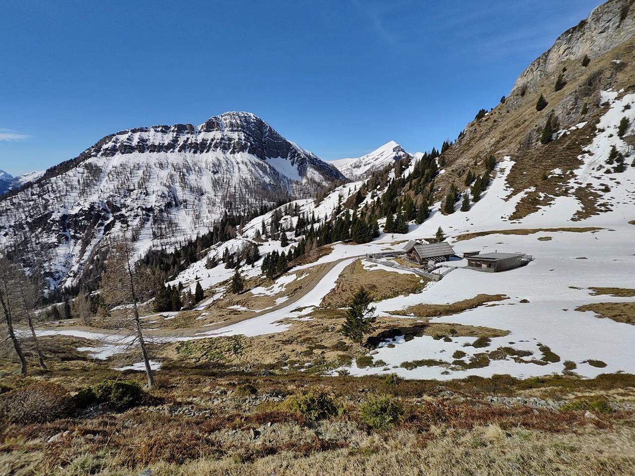 Dort oben endet auch die Liftanlage, die Skifahrer für die Abfahrt hinauf auf den Berg bringt. Obwohl noch Schnee liegt, ist der Winterbetrieb vorüber. Und der Sommerbetrieb hat noch nicht richtig begonnen, weshalb die Almhütten derzeit geschlossen sind.