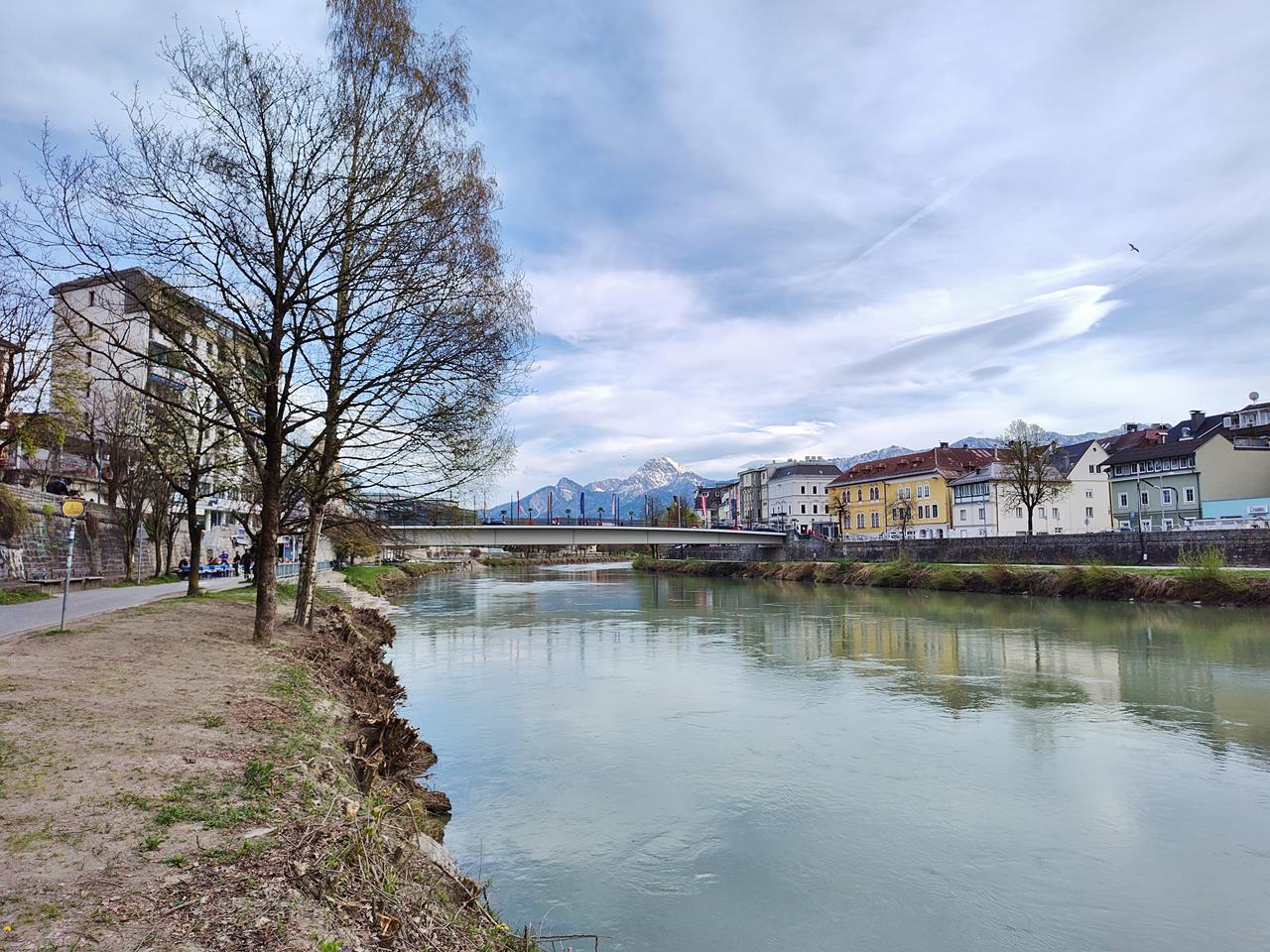 Der Schalk an der Draubrücke in die historische Innenstadt. Dahinter die Karawanken.