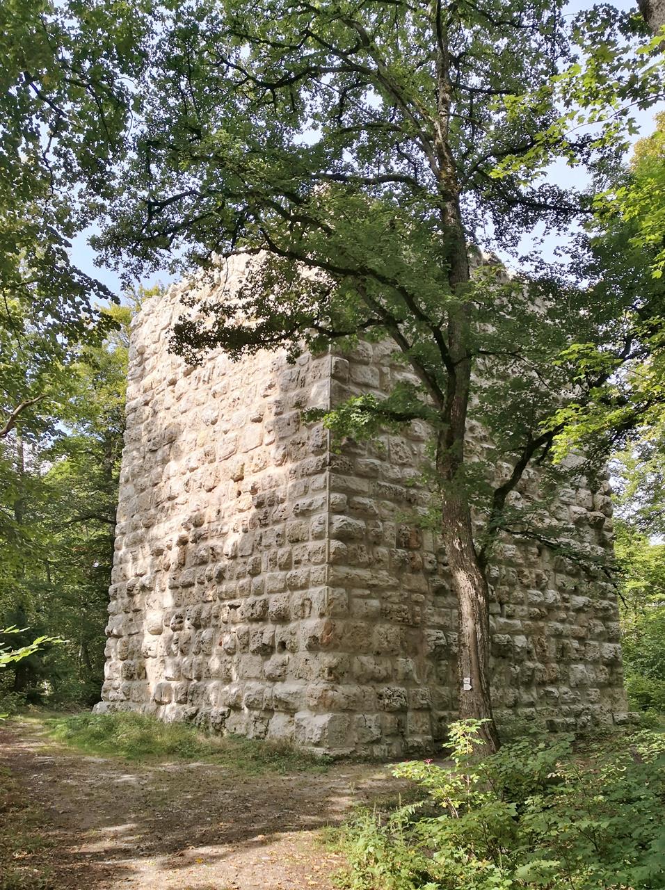 Durch schönen schattigen Mischwald geht es anschließend stetig bergauf bis zur Ruine der Konzenburg auf dem Konzenberg. Nur noch der mächtige Bergfried aus großen Kalksteinquadern ist erhalten, doch ich kann nirgendwo einen Eingang entdecken.Dann geht es bergab in Richtung des Eltatals. Der 16 km lange linke Nebenfluss der Donau entspringt in einem Waldgebiet zwischen Trossingen, Spaichingen und Gunningen und mündet in Tuttlingen in die Donau. Der Fluss ist in den letzten Jahren renaturiert worden und schlängelt sich nun wieder durch sein schönes Tal in Richtung Tuttlingen.