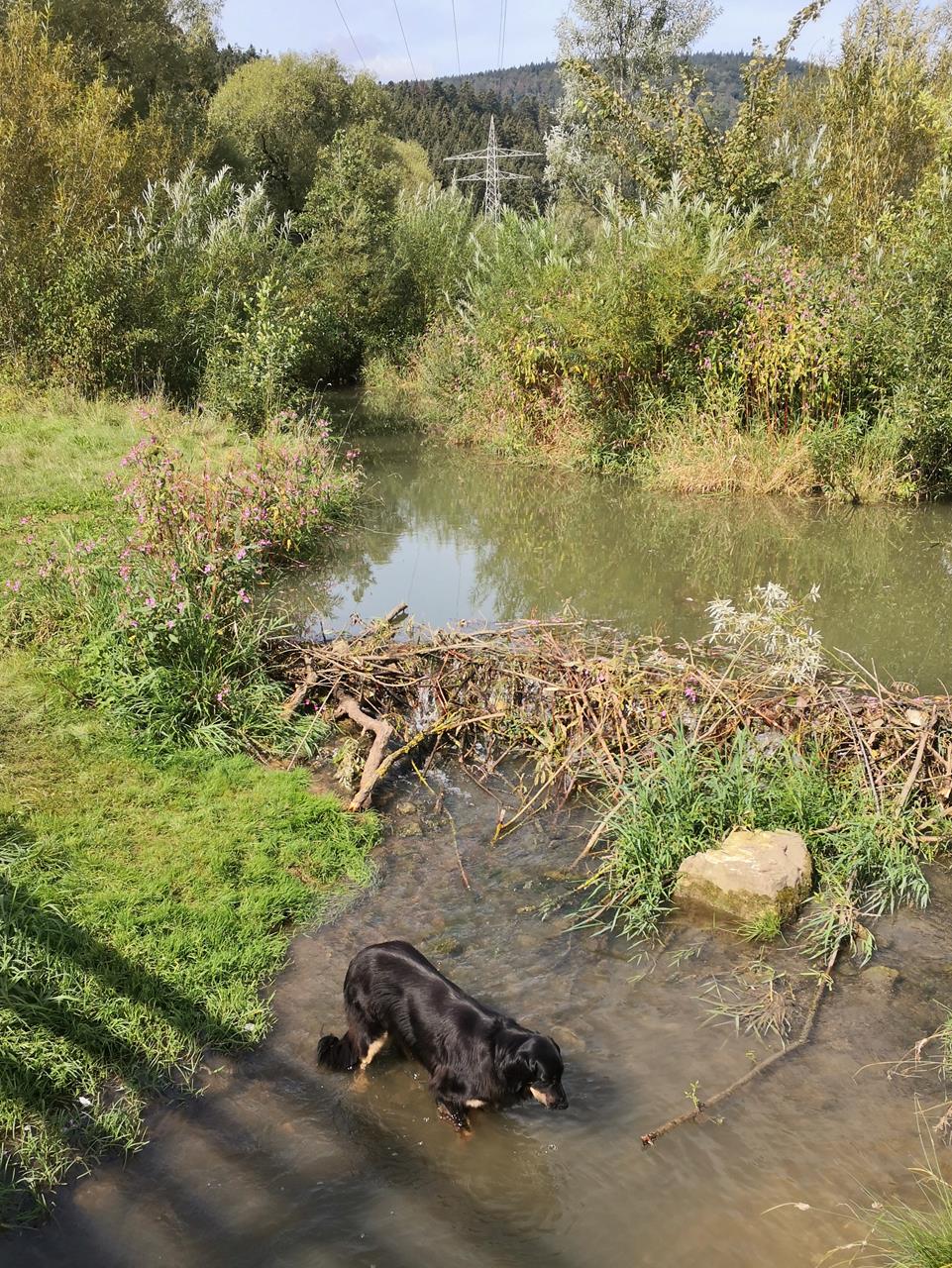 Doxi nutzt die Gelegenheit und steigt mehrmals in den Fluss, um sich abzukühlen und zu trinken. Und ich genieße noch einmal das herrliche Spätsommerwetter. Fast ist es mir ein wenig zu viel Sonne, aber bald schon wird der Herbst kommen und dann werden wir uns wieder nach der Sonne sehnen.
