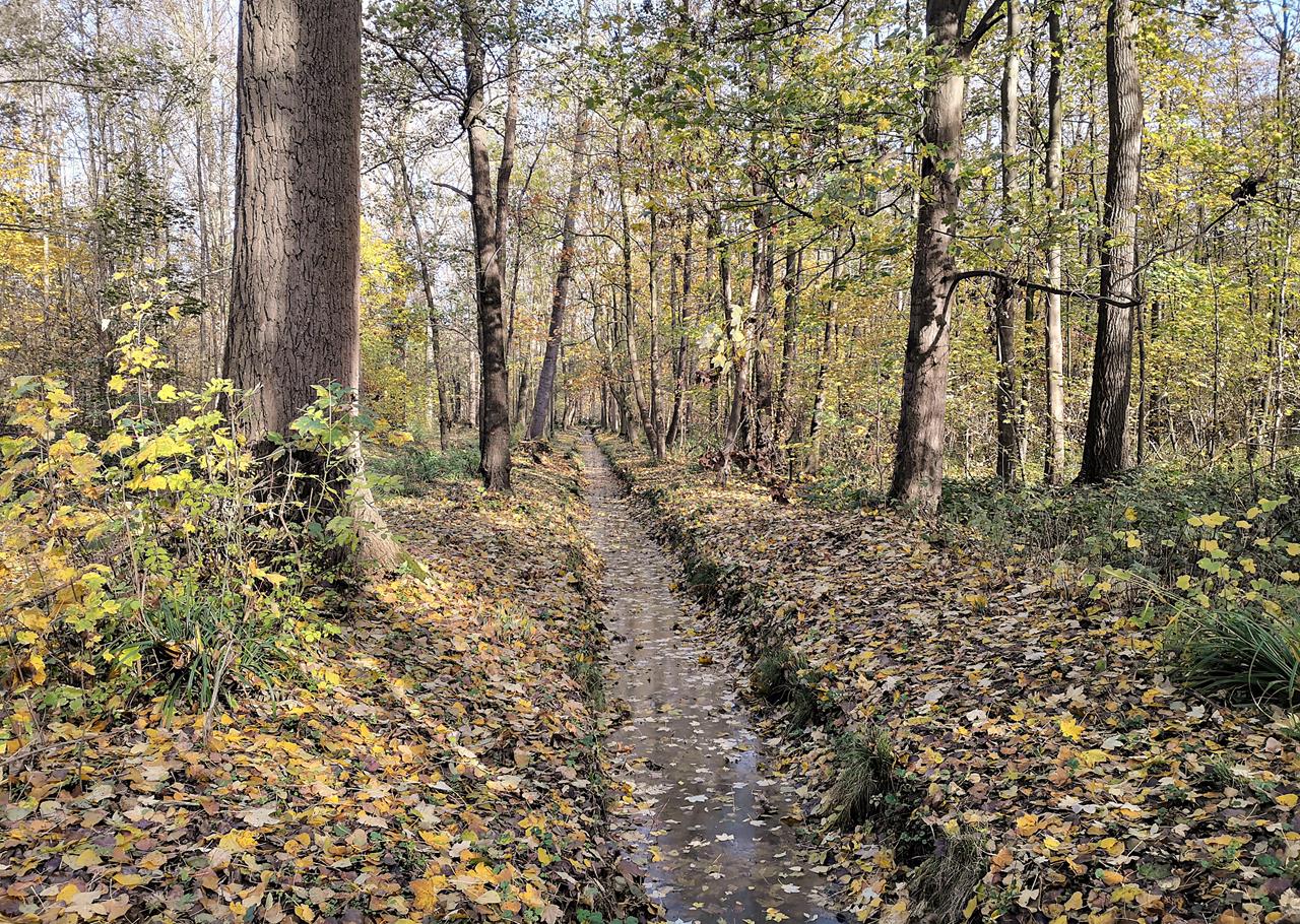Durch den Wald laufen wir auf das große Niers-Klärwerk Cloerbruch und auf die Niers zu. Dann geht es flussabwärts in Richtung Norden durch das Naturschutzgebiet Niersbruch.