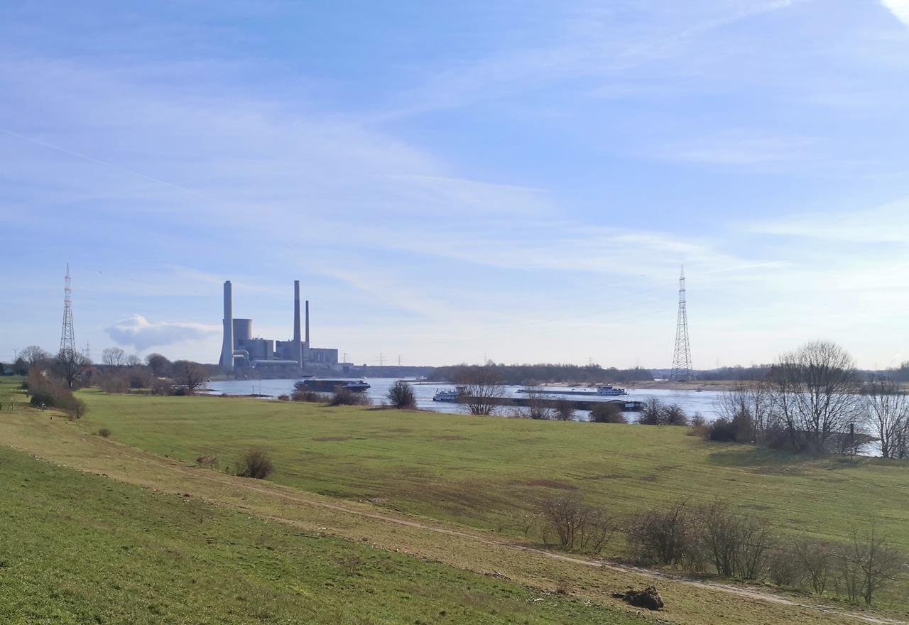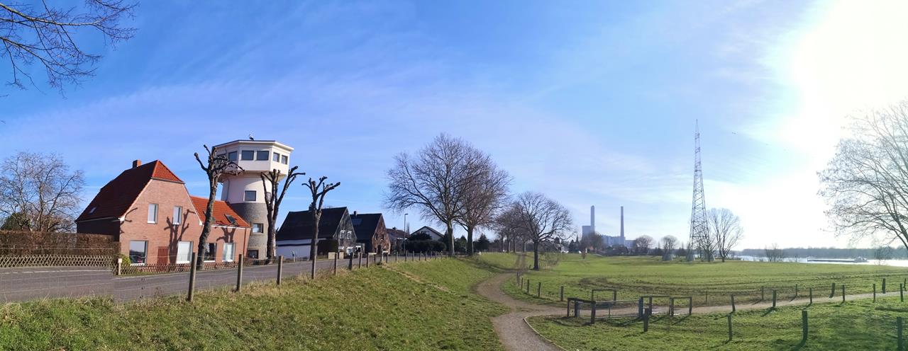 Von der Rheinpromenade im Voerder Stadtteil Götterswickerhamm ging es mehrere Kilometer in nördlicher Richtung am Rhein entlang und anschließend in einer großen Schleife durch die Momm-Niederung mit dem Mommbach zurück zu unserem Startpunkt.Die Landschaft auf dieser 12 km langen Tour ist ganz flach und verwöhnt uns mit weiten Blicken über den Rhein und die von Kopfweiden durchsetzten Feld- und Wiesenflächen. Im Hintergrund ist immer wieder das mächtige Steinkohlekraftwerk von Voerde zu sehen, das 2017 stillgelegt wurde.