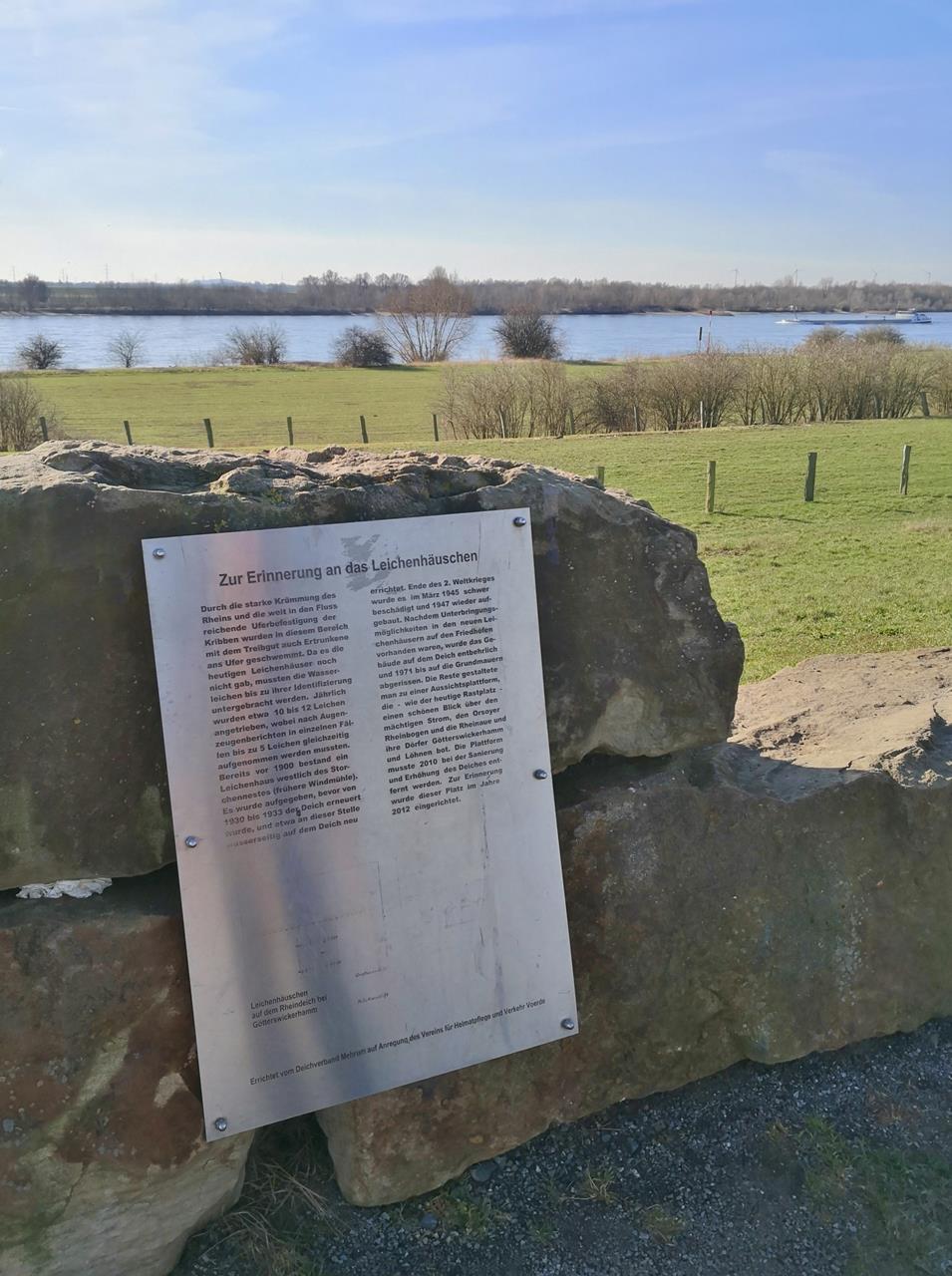 Unterwegs begegnet uns am Rheindeich an der starken Krümmung des Orsoyer Rheinbogens ein Kuriosum: Dort stand bis 1971 ein historisches Leichenhäuschen.