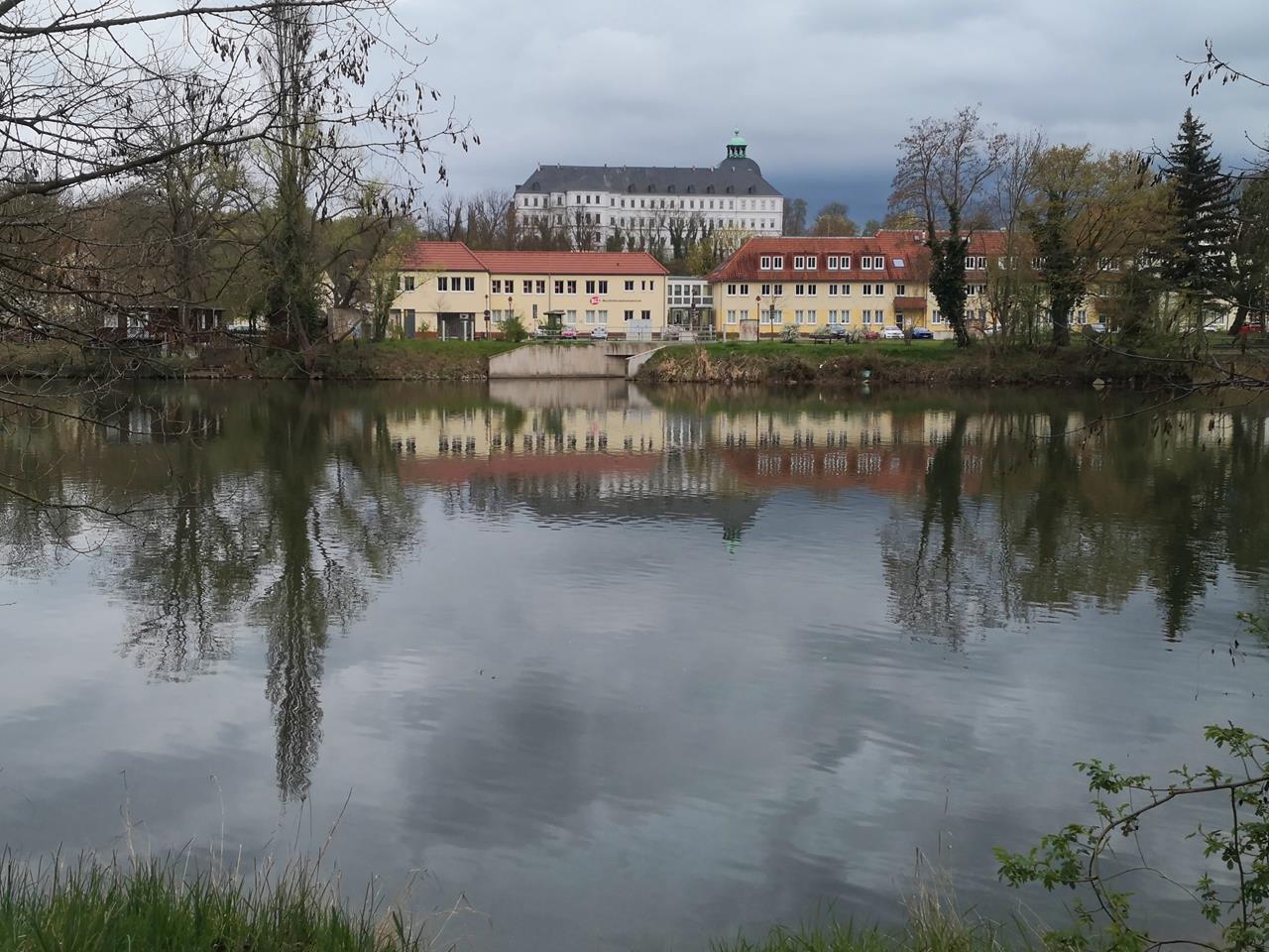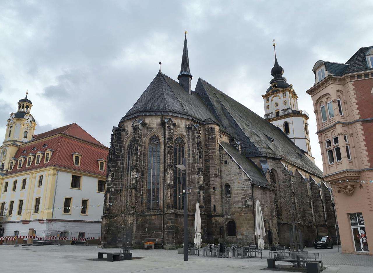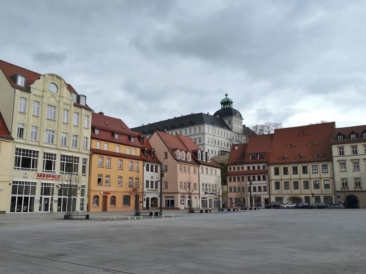 Sinnbild dafür ist auch das frühbarocke Schloss Neu-Augustusburg, das oberhalb der Saale und der Kernstadt mit rund 40.000 Einwohnern thront.Es enthält u.a. die weitgehend im Original erhaltene Schlosskirche St. Trinitatis, die von außen gar nicht als Kirche erkennbar ist. Ihr Innenraum zählt zu den schönsten frühbarocken Sakralbauten Mitteleuropas.