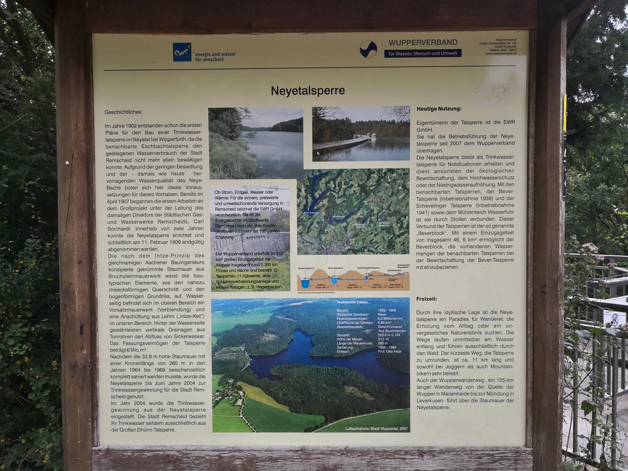 Die Neyetalsperre liegt gleich neben der beliebten Bevertalsperre, ist aber wesentlich kleiner und weniger stark frequentiert, weil dort das Baden und der Wassersport verboten sind.Die Talsperre wurde im Jahr 1909 eröffnet und staut den Neye-Bach auf. Aufgrund der hervorragenden Wasserqualität des Bachs wurde die Talsperre bis 2004 zur Wasserversorgung der nahe gelegenen Stadt Remscheid genutzt.