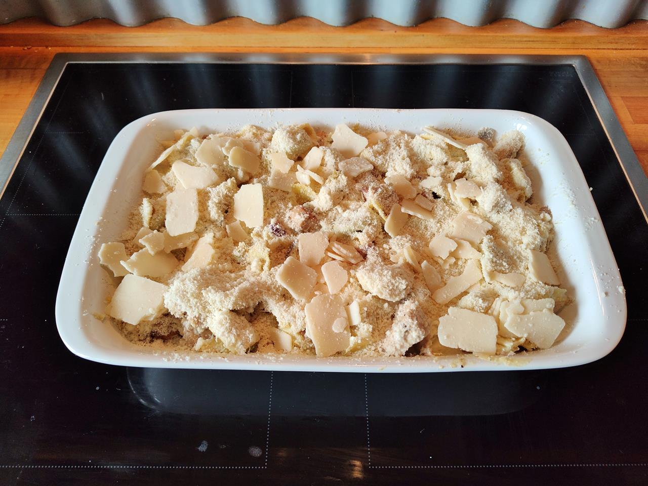 Nachdem man diese Mischung in eine Auflaufform gegeben hat, kommt die angerührte Sauce obenauf und als Abschluss noch einmal 100 g Parmesan, gerieben oder gehobelt. Das Ganz dann bei 200 Grad im Ofen für ca. 30 Minuten überbacken, bis sich stellenweise eine goldbraune Kruste zeigt. Et voila: schmeckt wirklich lecker!
