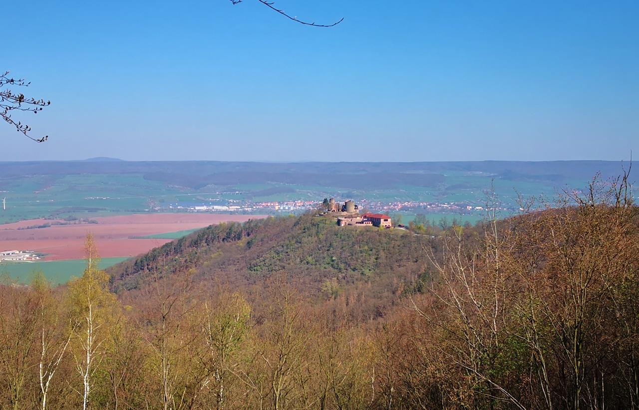 Vom Hauptkamm des Gebirgszuges blicken wir auf die Ruine Rothenburg hinab, die auf einem vorgelagerten Bergsporn angesiedelt ist und zurzeit renoviert wird. Auch die Bergspitzen des Harzes in rund 45 Kilometer sind zu sehen. Ich habe mein Fernglas dabei und kann damit mühelos den großen Funkmast auf dem Brocken ausmachen. Toll ist das!