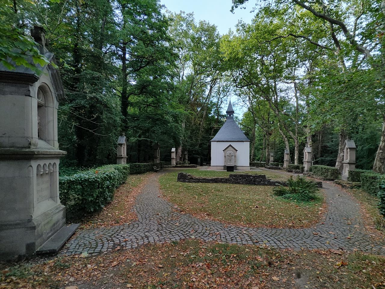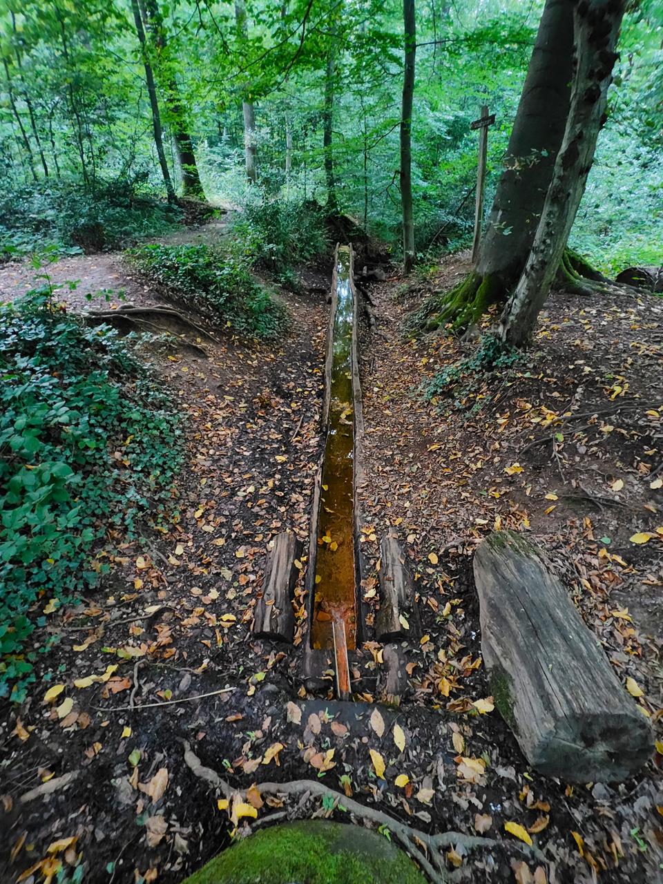 Der namensgebende Rheinbach und der Ortskaulenbach ziehen sich mäandernd durch den Wald und stauen sich in kleinen Teichen auf. Nahe des Rheinbachs komme ich erst an der Waldkapelle mit ihrem Kreuzweg vorbei, ein Pilgerort auf dem Weg nach Trier und Santiago de Compostelle. Angeblich wurde hier am 20. Januar 1681 beim Spalten einer Buche in deren Stamm die Buchstaben des Christusmonogramms IHS entdeckt und daraufhin eine erste Kapelle errichtet.