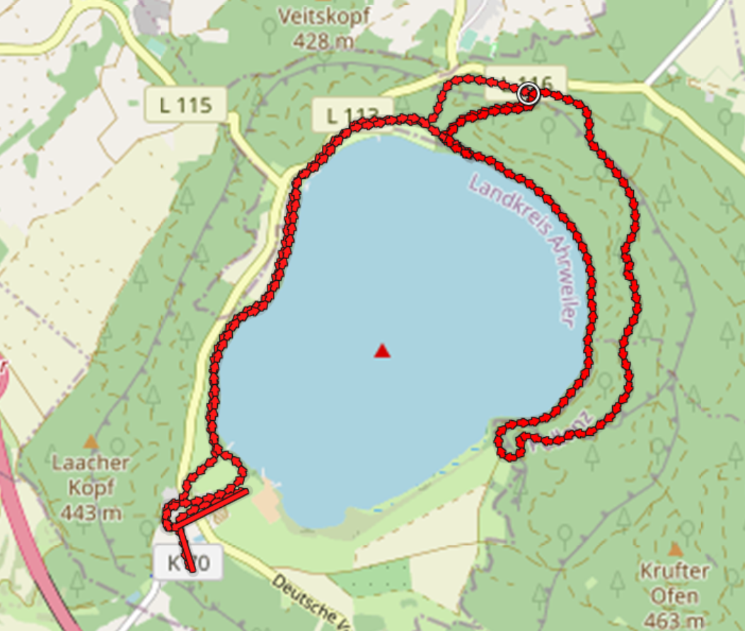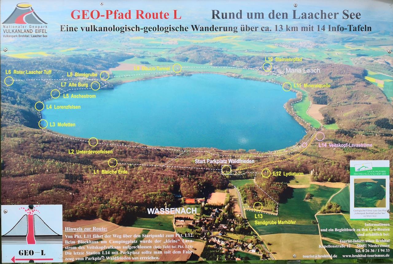 Ein Teil des Baumaterials stammt aus den Steinbrüchen am See, der vulkanischen Ursprungs ist. Dies zeigt sich noch heute in Form von Ausgasungen. Der ovale See ist mit rund 3,3 km² der größte See in Rheinland-Pfalz und wird vollständig von einem mehr als 100 m hohen bewaldeten Wall umgeben.