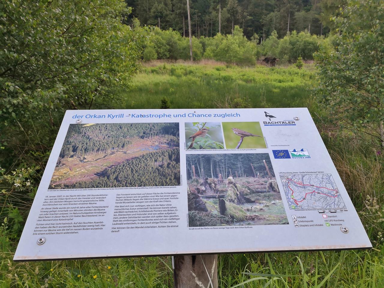 Im Tal der Heve sind noch immer die Sturmschäden des Orkans Kyrill von 2007 zu sehen. Dort hat der Sturm besonders viele Bäume umgerissen. Außerdem begegnen uns mehrfach Gruppen abgestorbener Kiefern, die vollkommen braun sind. Das ist das Werk des Borkenkäfers nach seiner explosionsartigen Vermehrung im heißen Sommer von 2018.