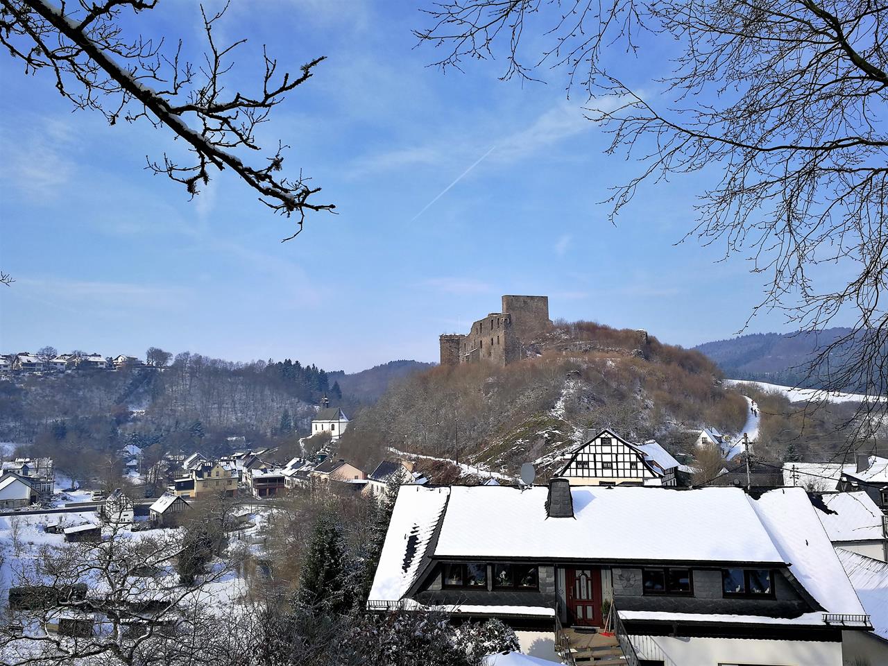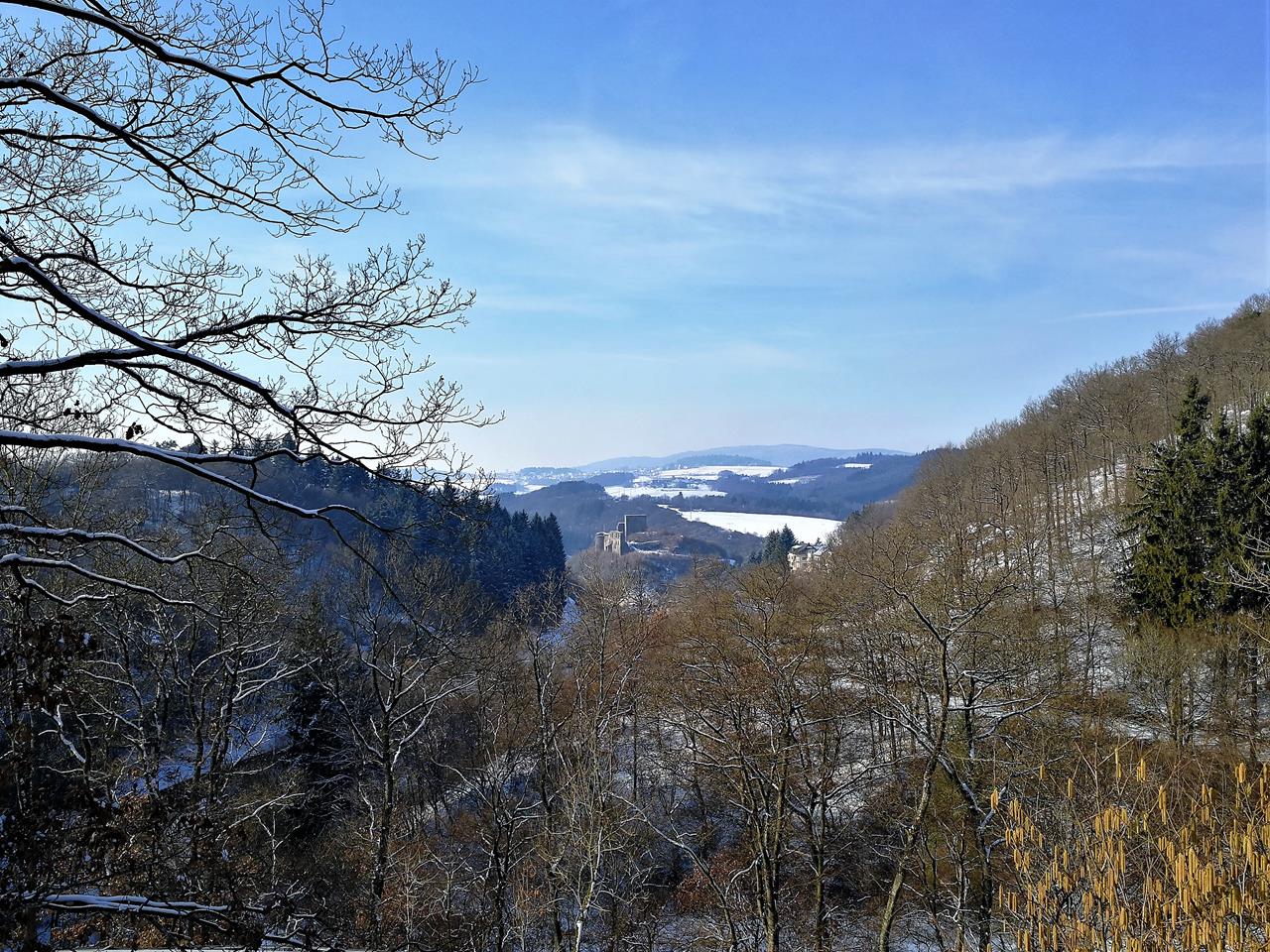 Wir folgen einem schmalen Bergpfad entlang der Hangkante und steigen wieder in das Nitzbachtal hinab. Gemessen an unserem normalen Wandertempo sind wir heute im Schnee ganz schön langsam unterwegs und mittlerweile habe ich auch schon komplett nasse Füße. Am Fuße der Virneburg beschließe ich deshalb spontan, den letzten Schlenker der Tour auszulassen und ein wenig abzukürzen.