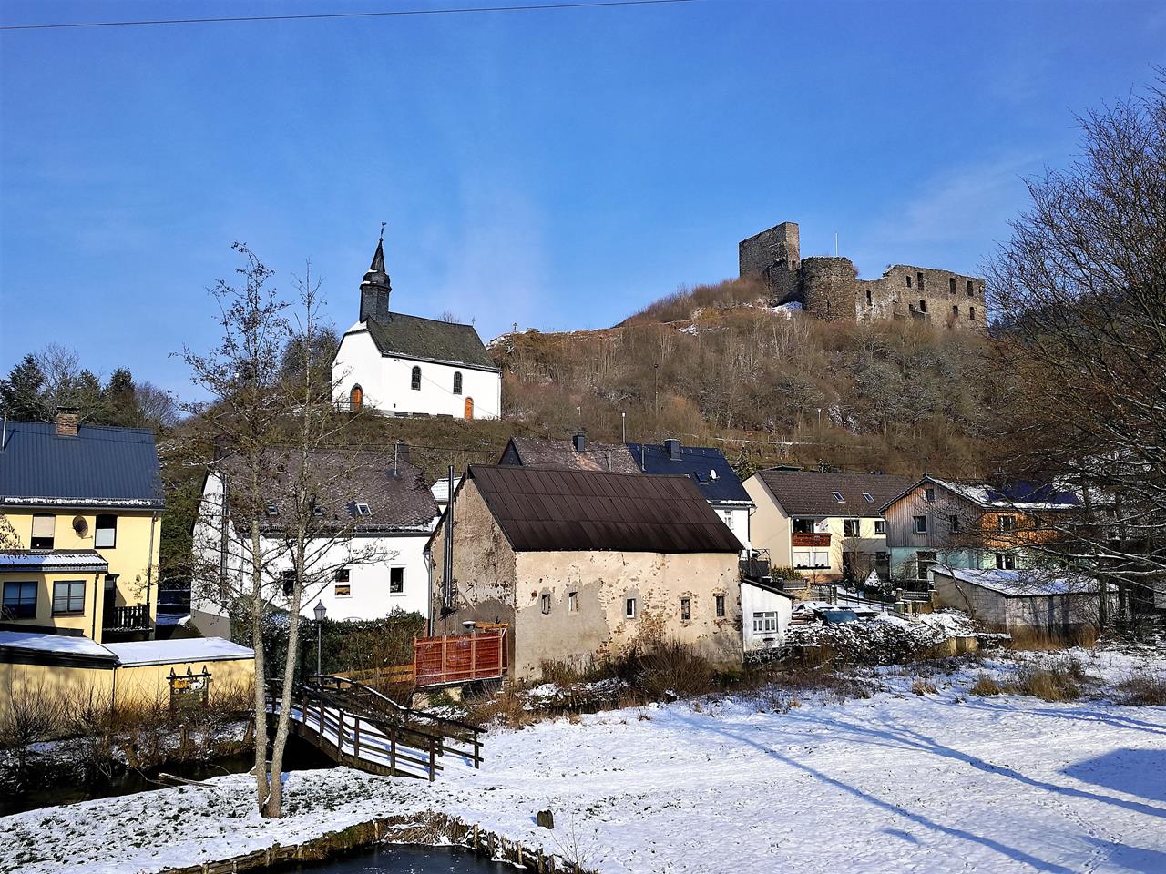 Der Traumpfad startet am Gemeindehaus. Es geht auf einer schmalen Brücke über den Nitzbach in den Ort hinein und hinauf zu einer kleinen Kapelle.