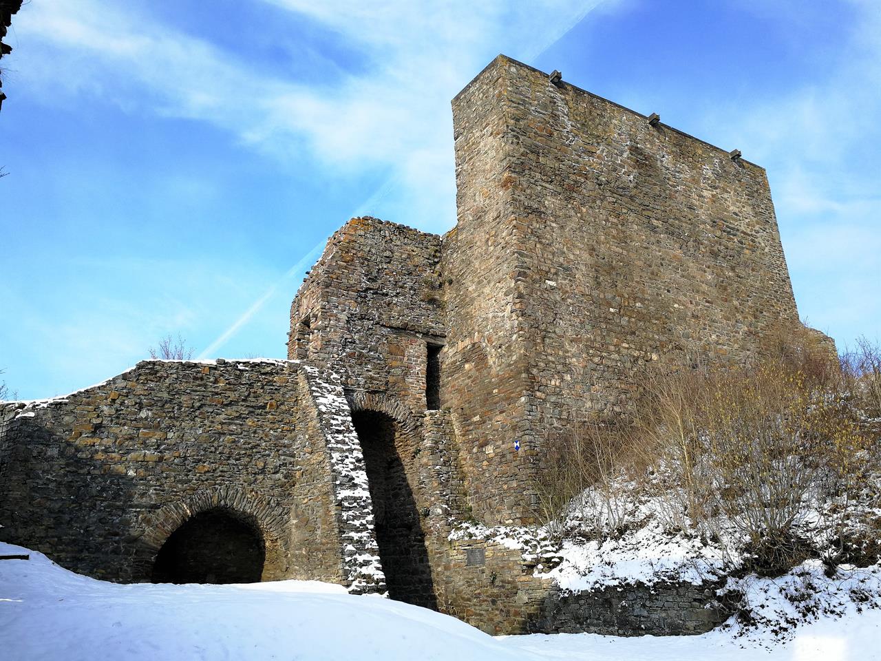 Von dort windet sich ein enger und vereister Pfad hinauf zur mächtigen Ruine der Virneburg. An diesem Morgen sind wir ganz alleine hier, sodass ich ungestört fotografieren kann. Doxi wälzt sich währenddessen erst einmal schön im Schnee ab.