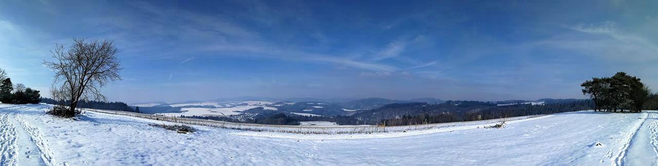 Stetig bergan führt der verschneite Weg durch ein Seitental in den Hochwald und dann zu den Wacholderheiden am Schafberg. Hier bietet sich uns ein prächtiges Eifelpanorama.