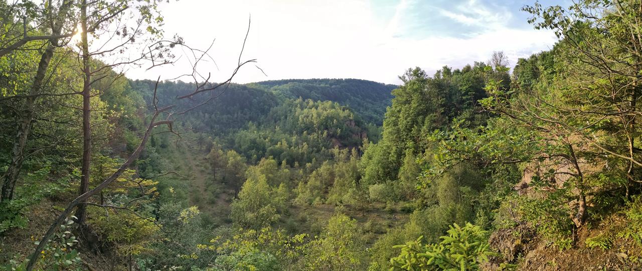 Auf dem Hauptkamm kommen wir an einem großen Funkmast vorbei und erreichen bald die abgesperrte Grenze zu einem aufgelassenen Steinbruch am Ebersberg. Deistersandstein wurde vom Mittelalter bis in die Neuzeit abgebaut und für Bauzwecke verwendet. Wir laufen am steil abfallenden Rand des Steinbruchs entlang und erhaschen dabei einige schöne Blick in die Ebene unterhalb des Deisters. Eine wirklich sehr schöne, aber auch schweißtreibende Abendtour.